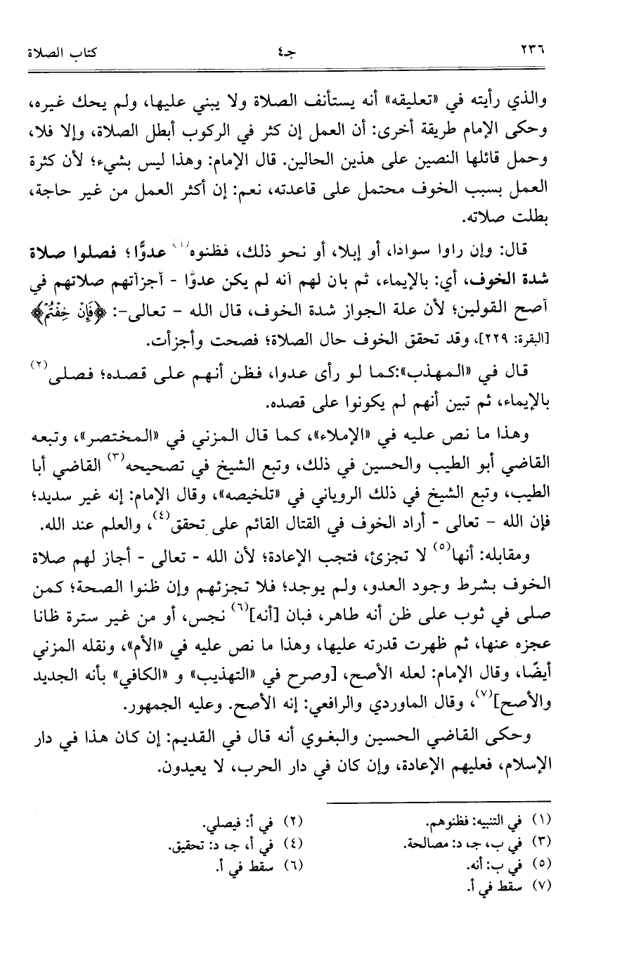 وهذا ما نص عليه في "الإملاء"، كما قال المزني في "المختصر"، وتبعه القاضي أبو الطيب والحسين في ذلك، وتبع الشيخ في تصحيحه القاضي أبا الطيب، وتبع الشيخ في ذلك الروياني في "تلخيصه"، وقال الإمام: إنه غير سديد؛ فإن الله – تعالى – أراد الخوف في القتال القائم على تحقق، والعلم عند الله.