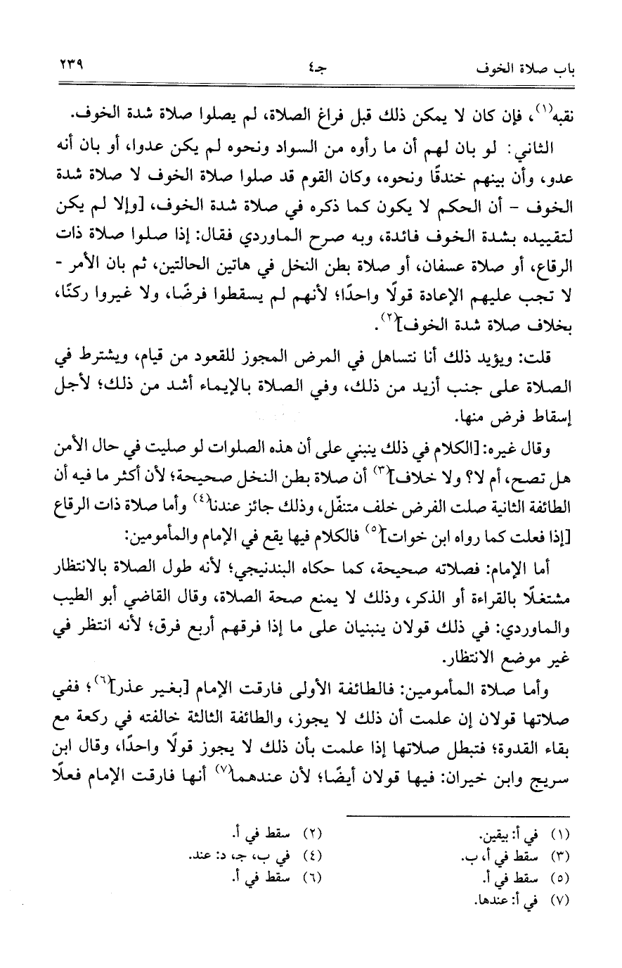 وقال غيره: [الكلام في ذلك ينبني على أن هذه الصلوات لو صليت في حال الأمن هل تصح، أم لا؟ ولا خلاف] أن صلاة بطن النخل صحيحة؛ لأن أكثر ما فيه أن الطائفة الثانية صلت الفرض خلف متنفّل، وذلك جائز عندنا وأما صلاة ذات الرقاع [إذا فعلت كما رواه ابن خوات] فالكلام فيها يقع في الإمام والمأمومين: