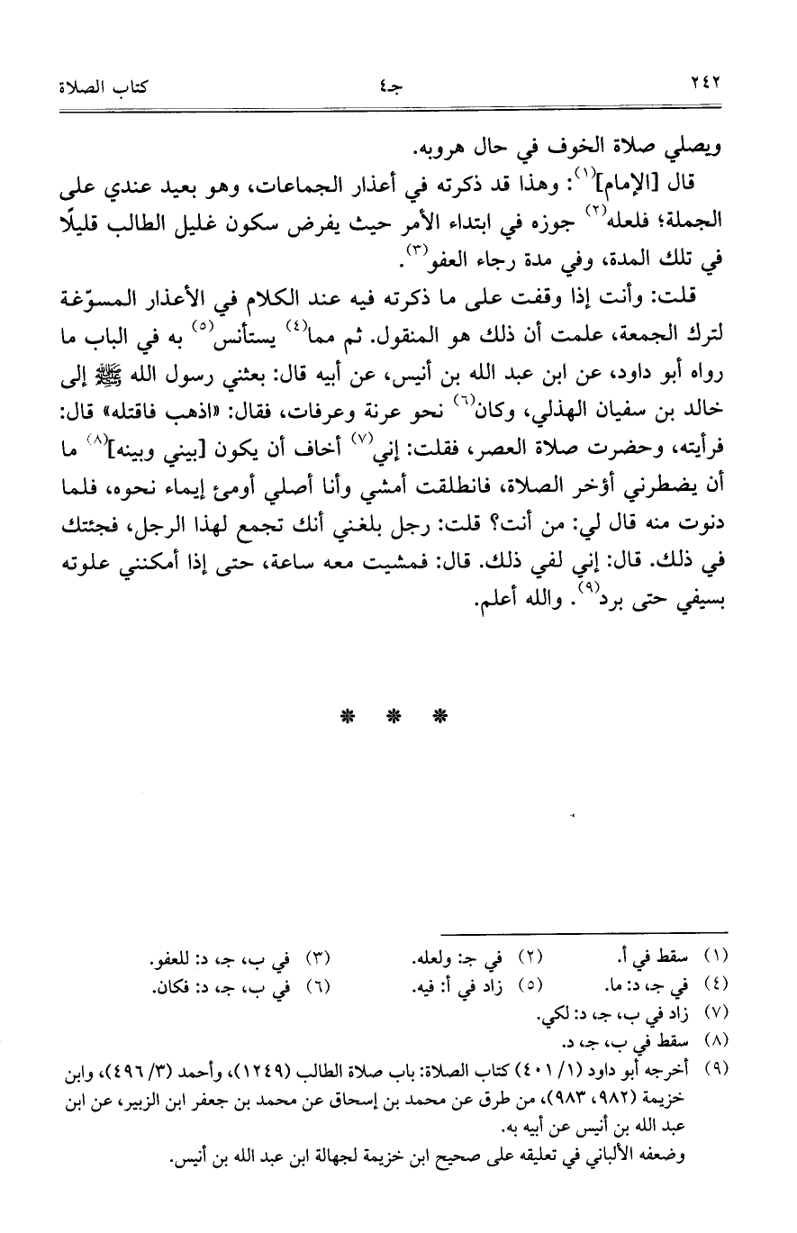 قلت: وأنت إذا وقفت على ما ذكرته فيه عند الكلام في الأعذار المسوّغة لترك الجمعة، علمت أن ذلك هو المنقول. ثم مما يستأنس به في الباب ما رواه أبو داود، عن ابن عبد الله بن أنيس، عن أبيه قال: بعثني رسول الله صلى الله عليه وسلم إلى خالد بن سفيان الهذلي، وكان نحو عرنة وعرفات، فقال: "اذهب فاقتله" قال: فرأيته، وحضرت صلاة العصر، فقلت: إني أخاف أن يكون [بيني وبينه] ما أن يضطرني أؤخر الصلاة، فانطلقت أمشي وأنا أصلي أومئ إيماء نحوه، فلما دنوت منه قال لي: من أنت؟ قلت: رجل بلغني أنك تجمع لهذا الرجل، فجئتك في ذلك. قال: إني لفي ذلك. قال: فمشيت معه ساعة، حتى إذا أمكنني علوته بسيفي حتى برد. والله أعلم.