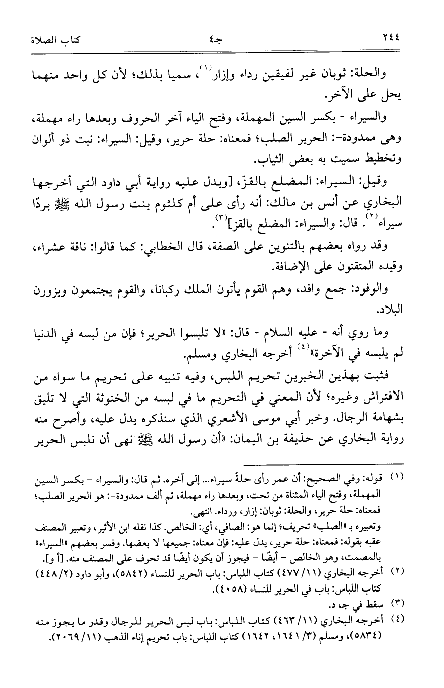 وقيل: السيراء: المضلع بالقزّ، [ويدل عليه رواية أبي داود التي أخرجها البخاري عن أنس بن مالك: أنه رأى على أم كلثوم بنت رسول الله صلى الله عليه وسلم برداً سيراء. قال: والسيراء: المضلع بالقز].