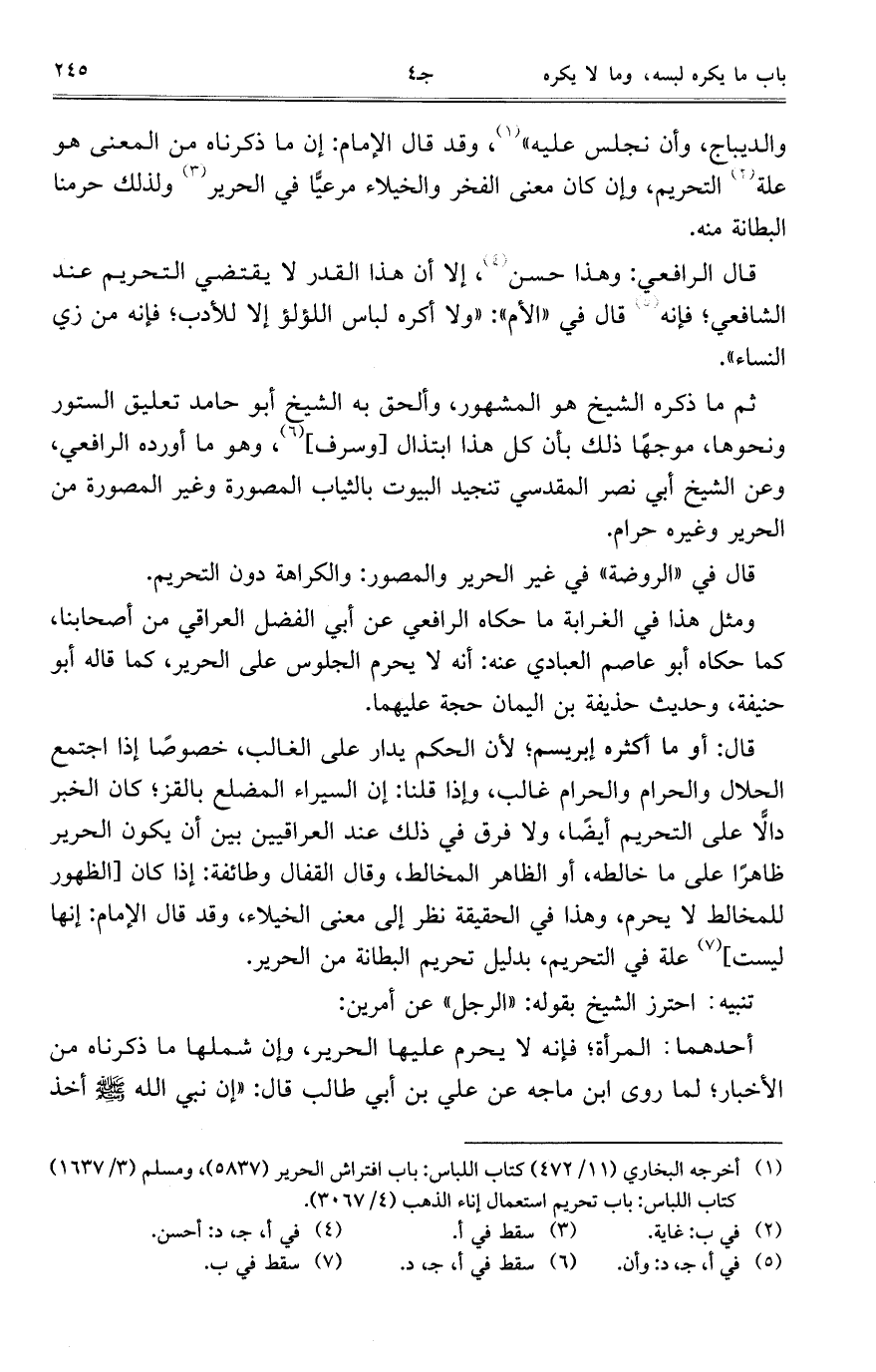 والديباج، وأن نجلس عليه"، وقد قال الإمم: إن ما ذكرناه من المعنى هو علة التحريم، وإن كان معنى الفخر والخيلاء مرعيًّا في الحرير ولذلك حرمنا البطانة منه.