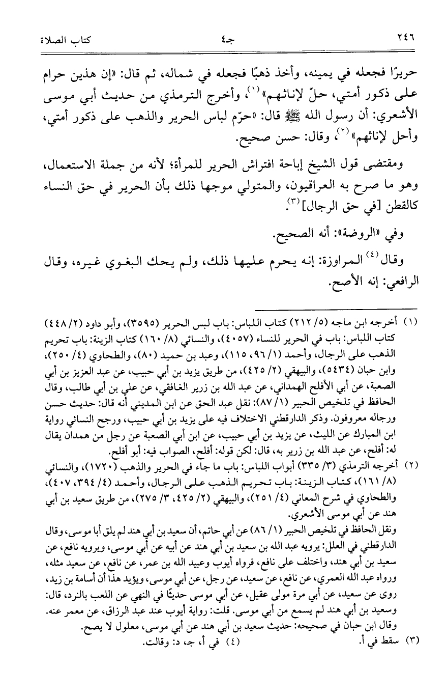 حريراً فجعله في يمينه، وأخذ ذهباً فجعله في شماله، ثم قال: "إن هذين حرام على ذكور أمتي، حلّ لإناثهم"، وأخرج الترمذي من حديث أبي موسى الأشعري: أن رسول الله صلى الله عليه وسلم قال: "حرّم لباس الحرير والذهب على ذكور أمتي، وأحل لإناثهم"، وقال: حسن صحيح.