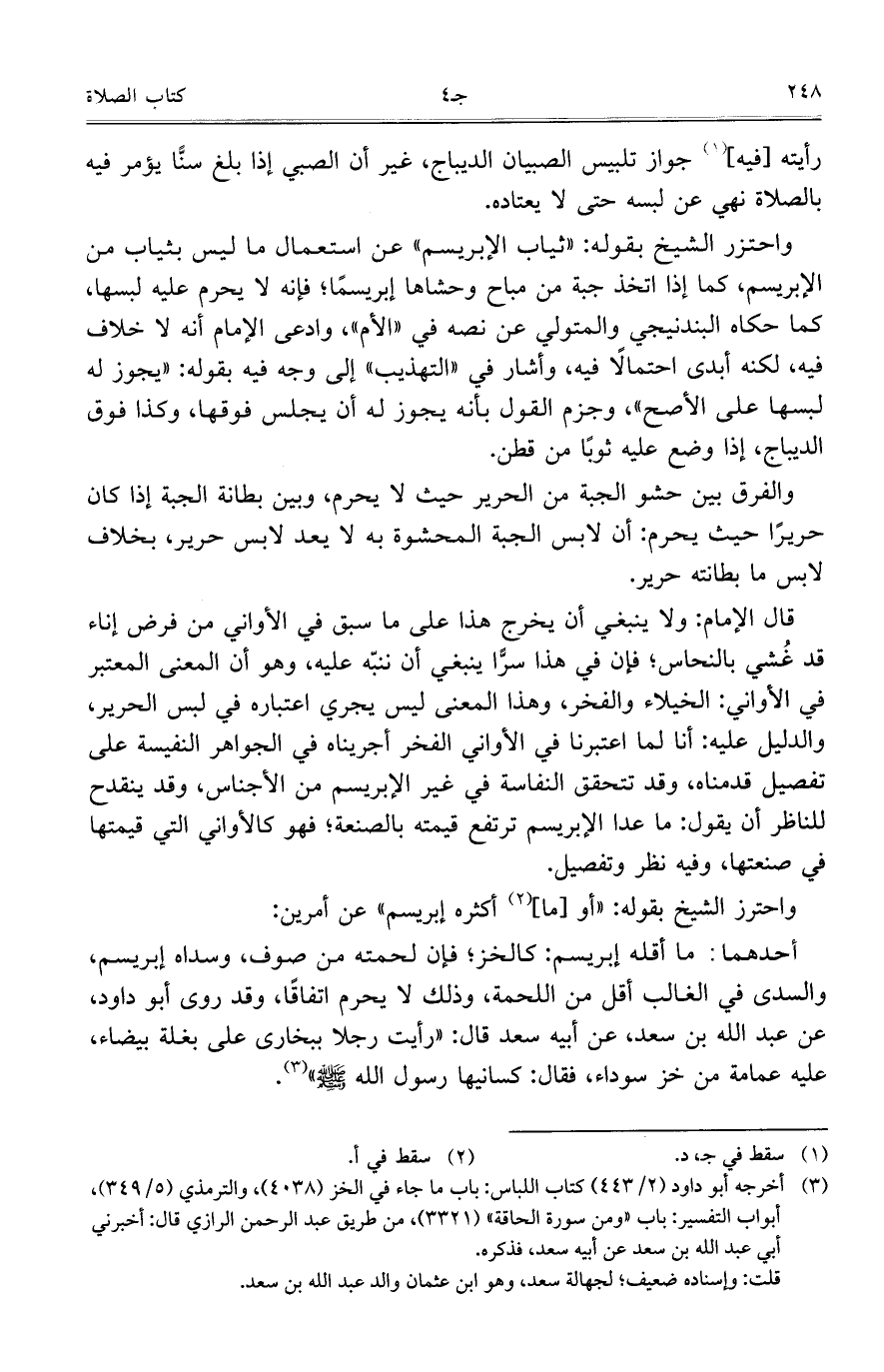 رأيته [فيه] جواز تلبيس الصبيان الديباج، غير أن الصبي إذا بلغ سنًّا يؤمر فيه بالصلاة نهي عن لبسه حتى لا يعتاده.