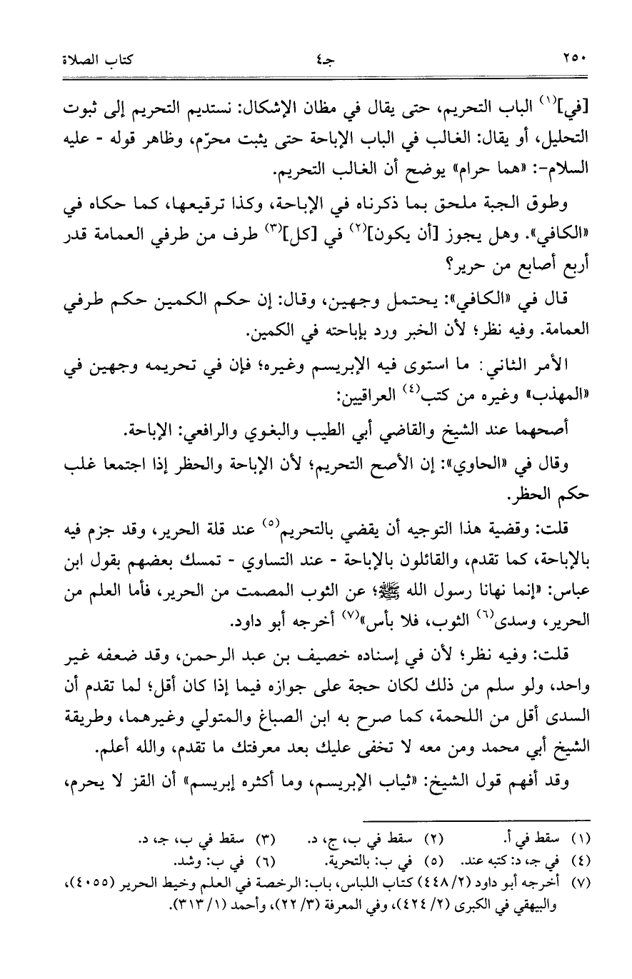 قلت: وقضية هذا التوجيه أن يقضي بالتحريم عند قلة الحرير، وقد جزم فيه بالإباحة، كما تقدم، والقائلون بالإباحة- عند التساوي- تمسك بعضهم بقول ابن عباس: "إنما نهانا رسول الله صلى الله عليه وسلم؛ عن الثوب المصمت من الحرير، فأما العلم من الحرير، وسدى الثوب، فلا بأس" أخرجه أبو داود.