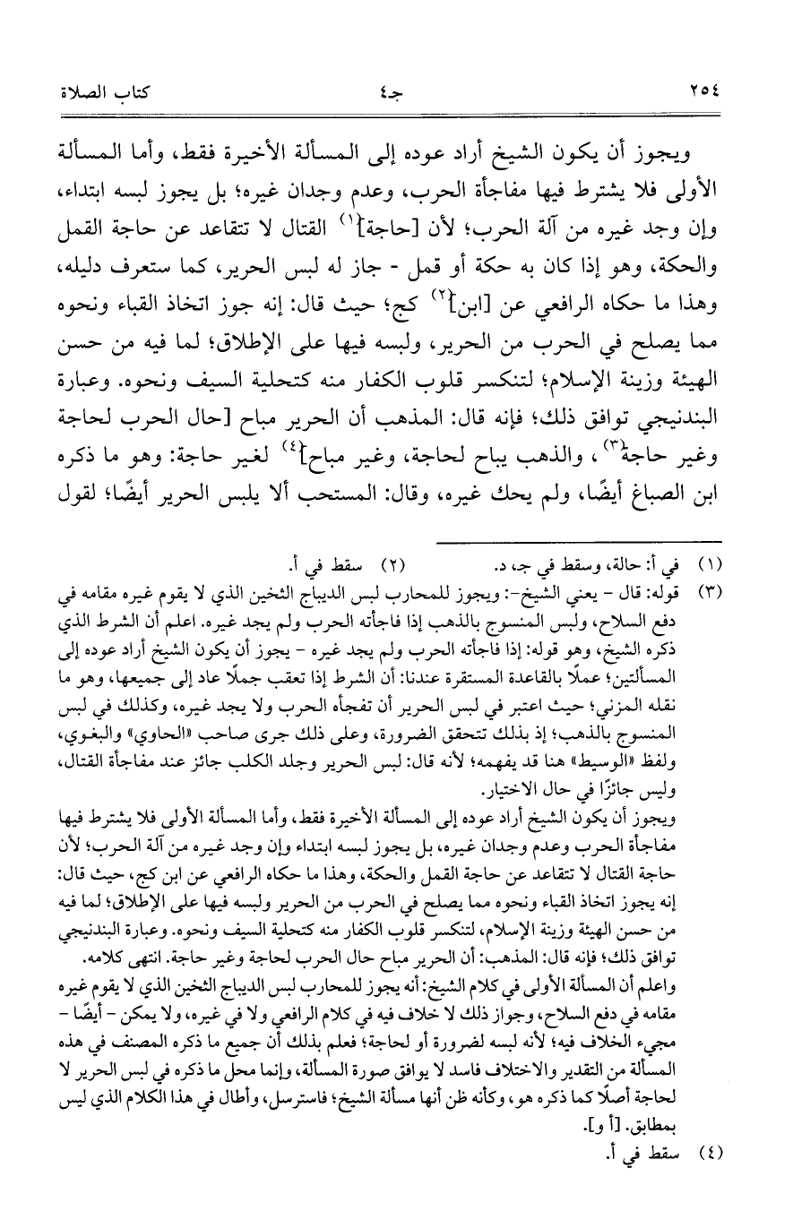 ويجوز أن يكون الشيخ أراد عوده إلى المسألة الأخيرة فقط، وأما المسألة الأولى فلا يشترط فيها مفاجأة الحرب، وعدم وجدان غيره؛ بل يجوز لبسه ابتداء، وإن وجد غيره من آلة الحرب؛ لأن [حاجة] القتال لا تتقاعد عن حاجة القمل والحكة، وهو إذا كان به حكة أو قمل- جاز له لبس الحرير، كما ستعرف دليله، وهذا ما حكاه الرافعي عن [ابن] كج؛ حيث قال: إنه جوز اتخاذ القباء ونحوه مما يصلح في الحرب من الحرير، ولبسه فيها على الإطلاق؛ لما فيه من حسن الهيئة وزينة الإسلام؛ لتنكسر قلوب الكفار منه كتحلية السيف ونحوه. وعبارة البندنيجي توافق ذلك؛ فإنه قال: المذهب أن الحرير مباح [حال الحرب لحاجة وغير حاجة، والذهب يباح لحاجة، وغير مباح] لغير حاجة: وهو ما ذكره ابن الصباغ أيضاً، ولم يحك غيره، وقال: المستحب ألا يلبس الحرير أيضاً؛ لقول