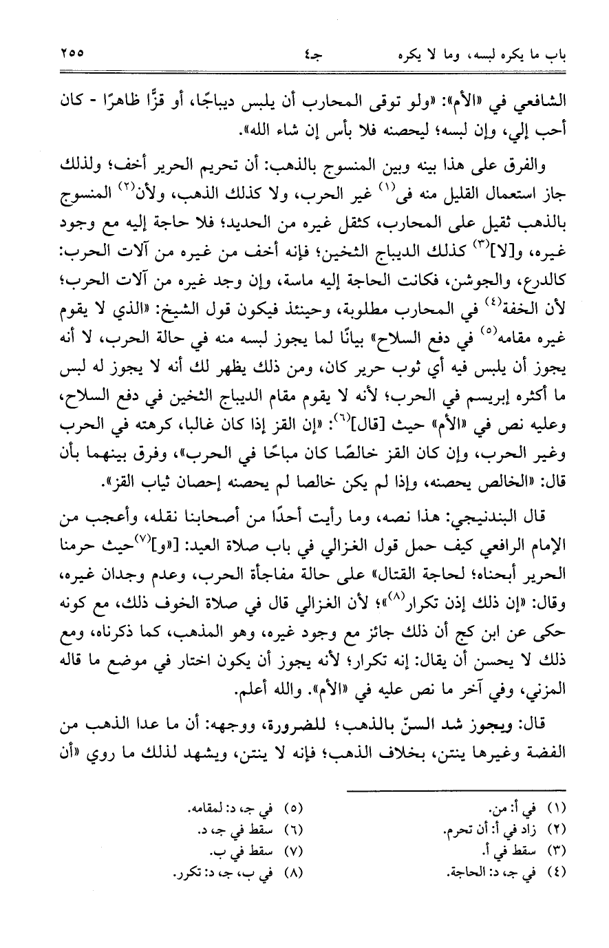 قال البندنيجي: هذا نصه، وما رأيت أحداً من أصحابنا نقله، وأعجب من الإمام الرافعي كيف حمل قول الغزالي في باب صلاة العيد: ["و] حيث حرمنا الحرير أبحناه؛ لحاجة القتال" على حالة مفاجأة الحرب، وعدم وجدان غيره، وقال: "إن ذلك إذن تكرار"؛ لأن الغزالي قال في صلاة الخوف ذلك، مع كونه حكى عن ابن كج أن ذلك جائز مع وجود غيره، وهو المذهب، كما ذكرناه، ومع ذلك لا يحسن أن يقال: إنه تكرار؛ لأنه يجوز أن يكون اختار في موضع ما قاله المزني، وفي آخر ما نص عليه في "الأم". والله أعلم.