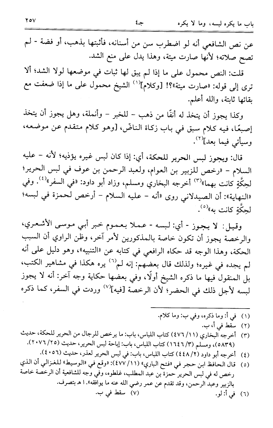 قال: ويجوز لبس الحرير للحكة، أي: إذا كان لبس غيره يؤذيه؛ لأنه- عليه السلام- "رخص للزبير بن العوام، ولعبد الرحمن بن عوف في لبس الحرير؛ لحِكَّةٍ كانت بهما" أخرجه البخاري ومسلم، وزاد أبو داود: "في السفر". وفي "النهاية": أن الصيدلاني روى "أنه- عليه السلام- أرخص لحمزة في لبسه؛ لحِكَّةٍ كانت به".