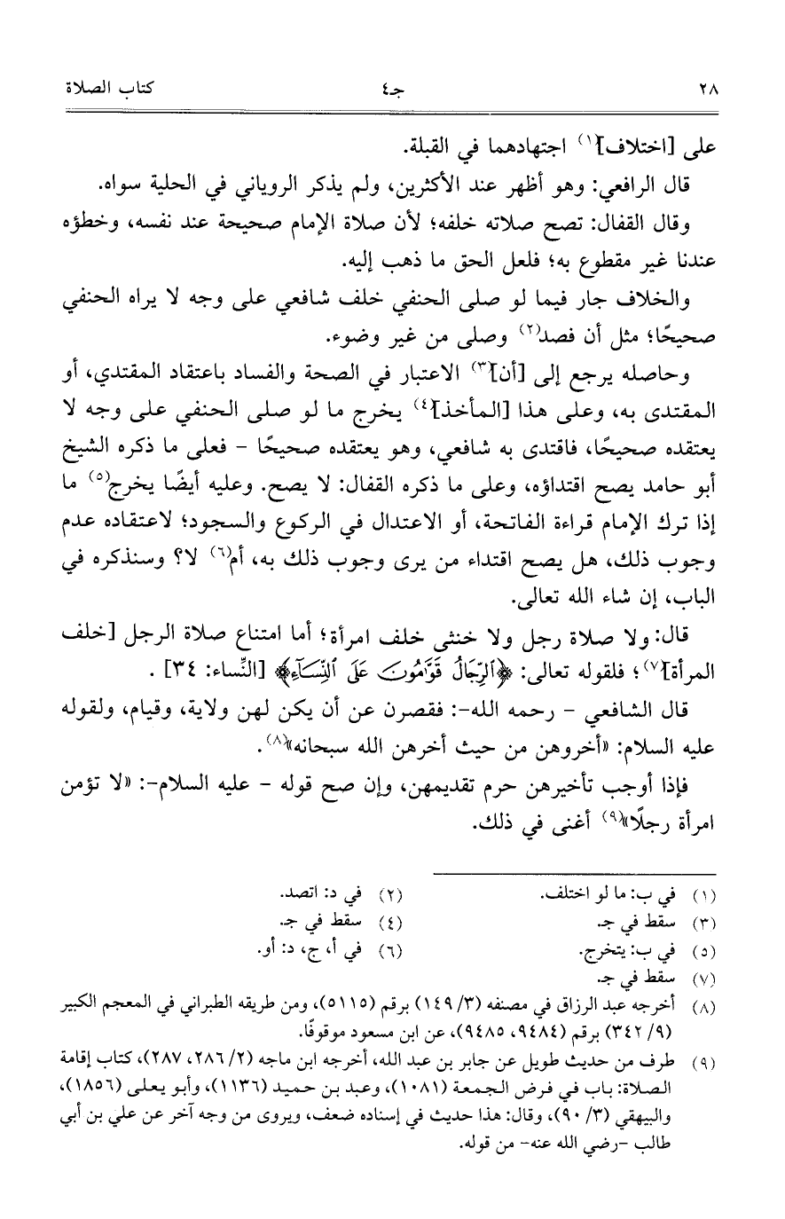 وحاصله يرجع إلى [أن] الاعتبار في الصحة والفاد باعتقاد المقتدي، أو المقتدى به، وعلى هذا [المأخذ] يخرج ما لو صلى الحنفي على وجه لا يعتقده صحيحاً، فاقتدى به شافعي، وهو يعتقده صحيحاً - فعلى ما ذكره الشيخ أبو حامد يصح اقتداؤه، وعلى ما ذكره القفال: لا يصح. وعليه أيضاً يخرج ما إذا ترك الإمام قراءة الفاتحة، أو الاعتدال في الركوع والسجود؛ لاعتقاده عدم وجوب ذلك، هل يصح اقتداء من يرى وجوب ذلك به، أم لا؟ وسنذكره في الباب، إن شاء الله تحالى.