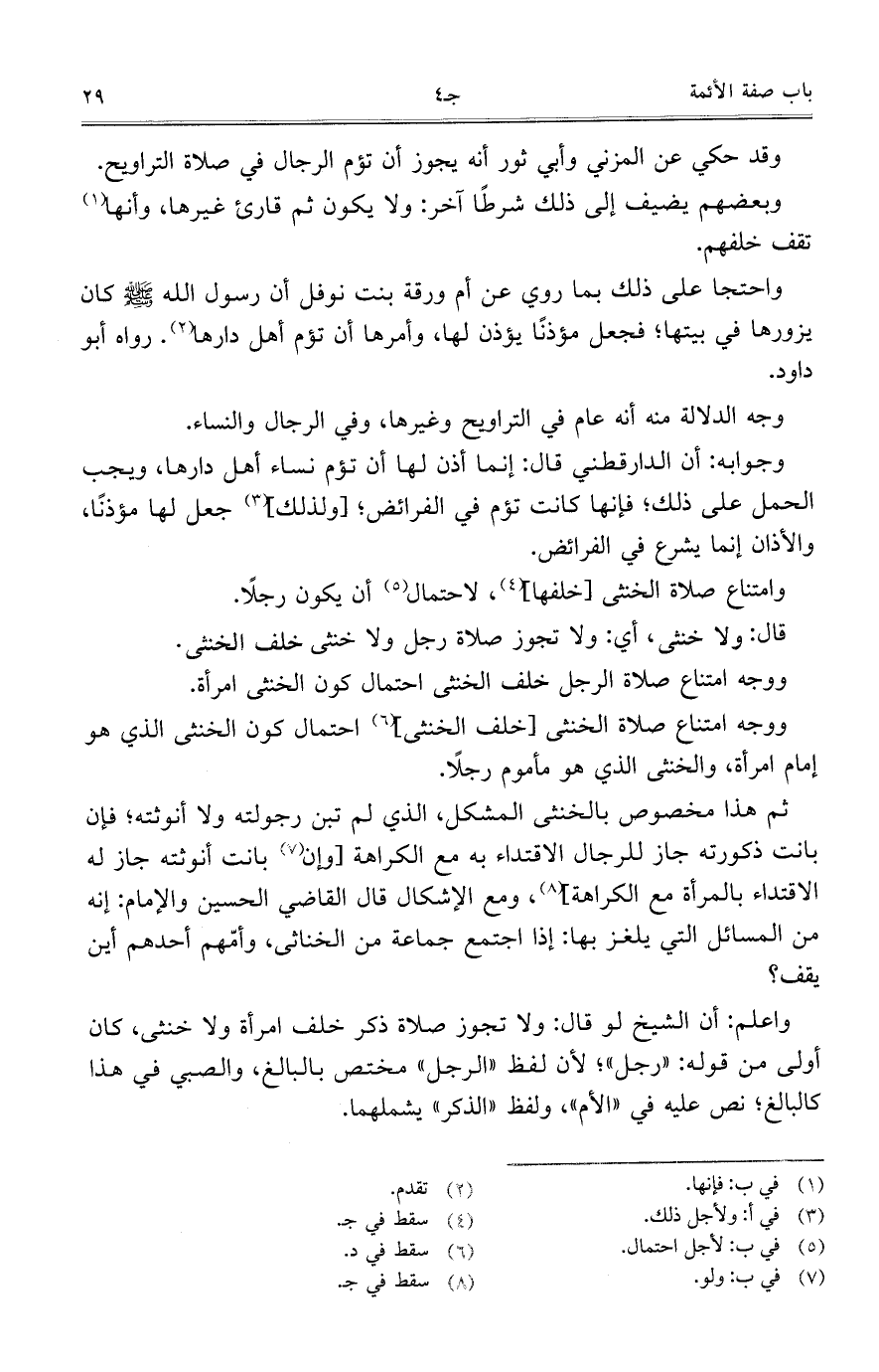 وبعضهم يضيف إلى ذلك شرطاً آخر: ولا يكون ثم قارئ غيرها، وأنها تقف خلفهم.