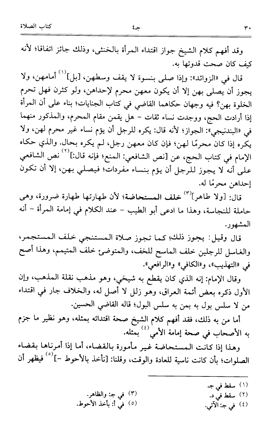 قال في "الزوائد": وإذا صلى بنسوة لا يقف وسطهن، [بل] أمامهن، ولا يجوز أن يصلي بهن إلا أن يكون معهن محرم لإحداهن، ولو كثرن فهل تحرم الخلوة بهن؟ فيه وجهان حكاهما القاضي في كتاب الجنايات؛ بناء على أن المرأة إذا أرادت الحج، ووجدت نساء ثقات - هل يقمن مقام المحرم، والمذكور منهما في "البندنيجي": الجواز؛ لأنه قال: يكره للرجل أن يؤم نساء غير محرم لهن، ولا يكره إذا كان محرماً لهن؛ فإن كان معهن رجل، لم يكره بحال. والذي حكاه الإمام في كتاب الحج، عن [نص الشافعي: المنع؛ فإنه قال:] نص الشافعي على أنه لا يجوز للرجل أن يؤم بنساء مفردات؛ فيصلي بهن، إلا أن تكون إحداهن محرماً له.