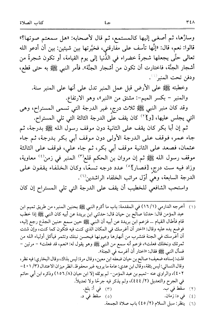 وقد كان منبر النبي صلى الله عليه وسلم ثلاث درجٍ، غير الدرجة التي تسمى المستراح، وهي التي يجلس عليها، [و] كان يقف على الدرجة الثالثة التي تلي المستراح.