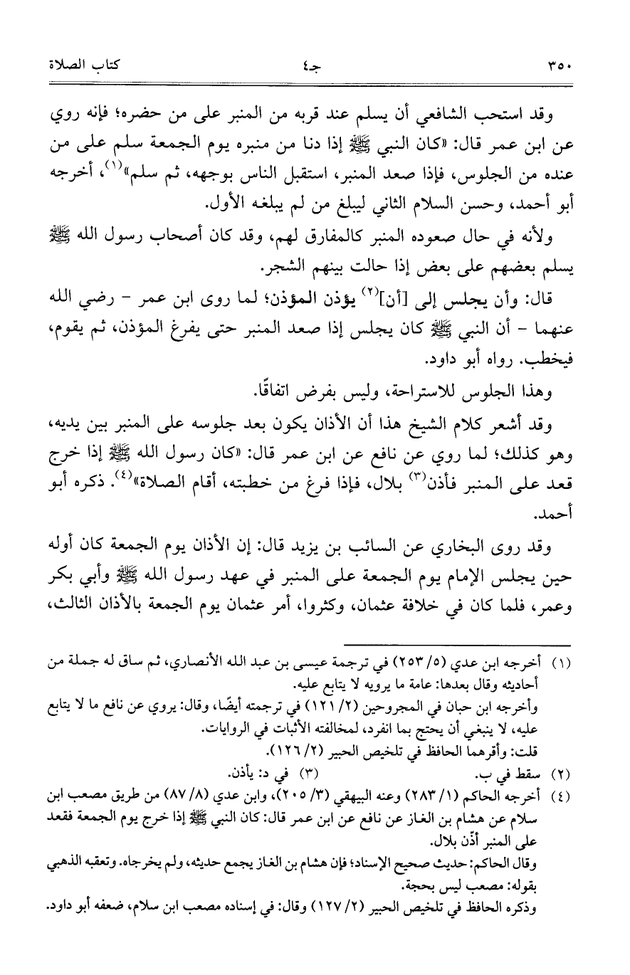 وقد استحب الشافعي أن يسلم عند قربه من المنبر على من حضره؛ فإنه روي عن ابن عمر قال: "كان النبي صلى الله عليه وسلم إذا دنا من منبره يوم الجمعة سلم على من عنده من الجلوس، فإذا صعد المنبر، استقبل الناس بوجهه، ثم سلم"، أخرجه أبو أحمد، وحسن السلام الثاني ليبلغ من لم يبلغه الأول.