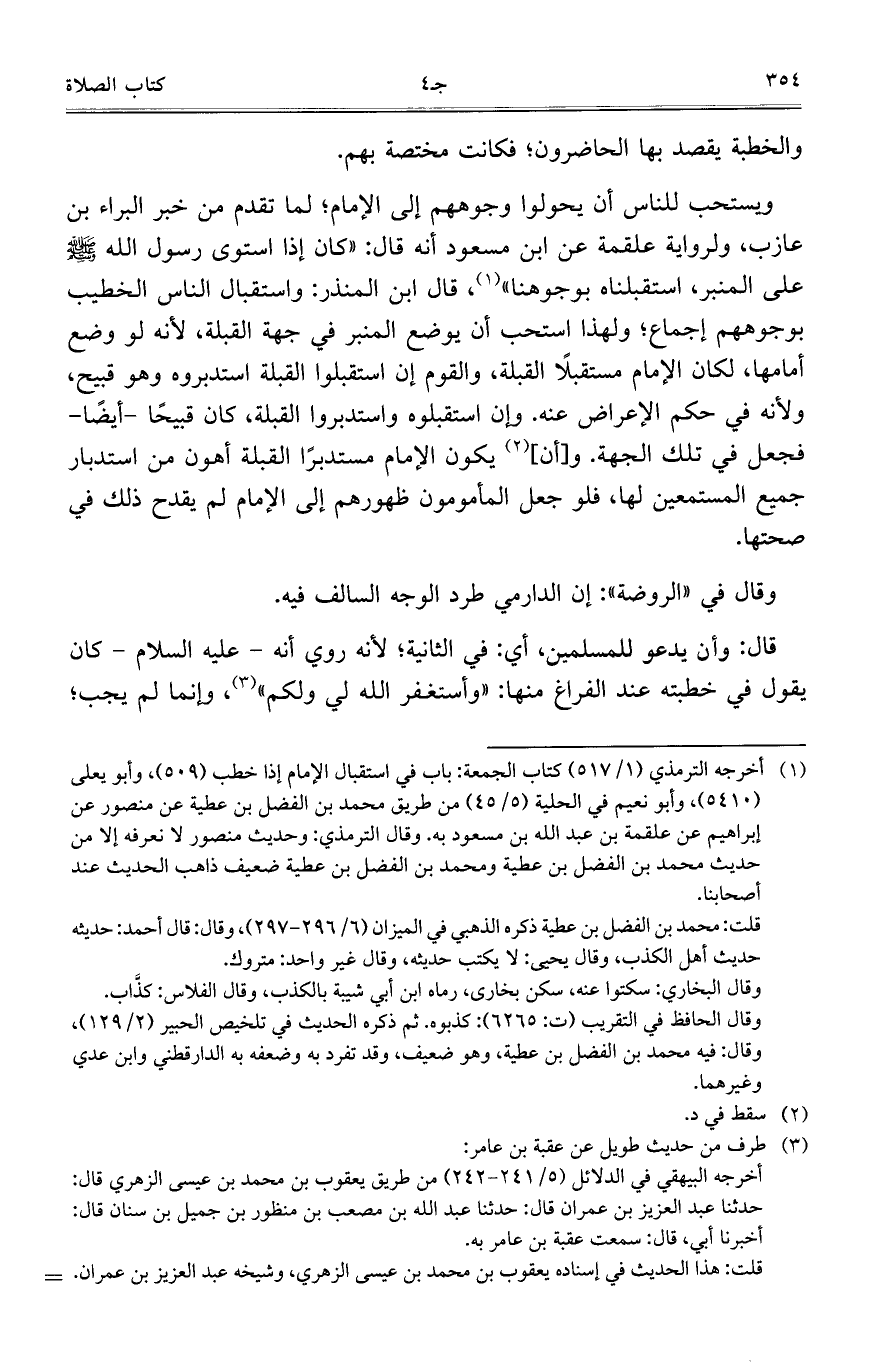 ويستحب للناس أن يحولوا وجوههم إلى الإمام؛ لما تقدم من خبر البراء بن عازب، ولرواية علقمة عن ابن مسعود أنه قال: "كان إذا استوى رسول الله صلى الله عليه وسلم على المنبر، استقبلناه بوجوهنا"، قال ابن المنذر: واستقبال الناس الخطيب بوجوههم إجماع؛ ولهذا استحب أن يوضع المنبر في جهة القبلة، لأنه لو وضع أمامها، لكان الإمام مستقبلاً القبلة، والقوم إن استقبلوا القبلة استدبروه وهو قبيح، ولأنه في حكم الإعراض عنه. وإن استقبلوه واستدبروا القبلة، كان قبيحاً- أيضاً- فجعل في تلك الجهة. و [أن] يكون الإمام مستدبراً القبلة أهون من استدبار جميع المستمعين لها، فلو جعل المأمومون ظهورهم إلى الإمام لم يقدح ذلك في صحتها.