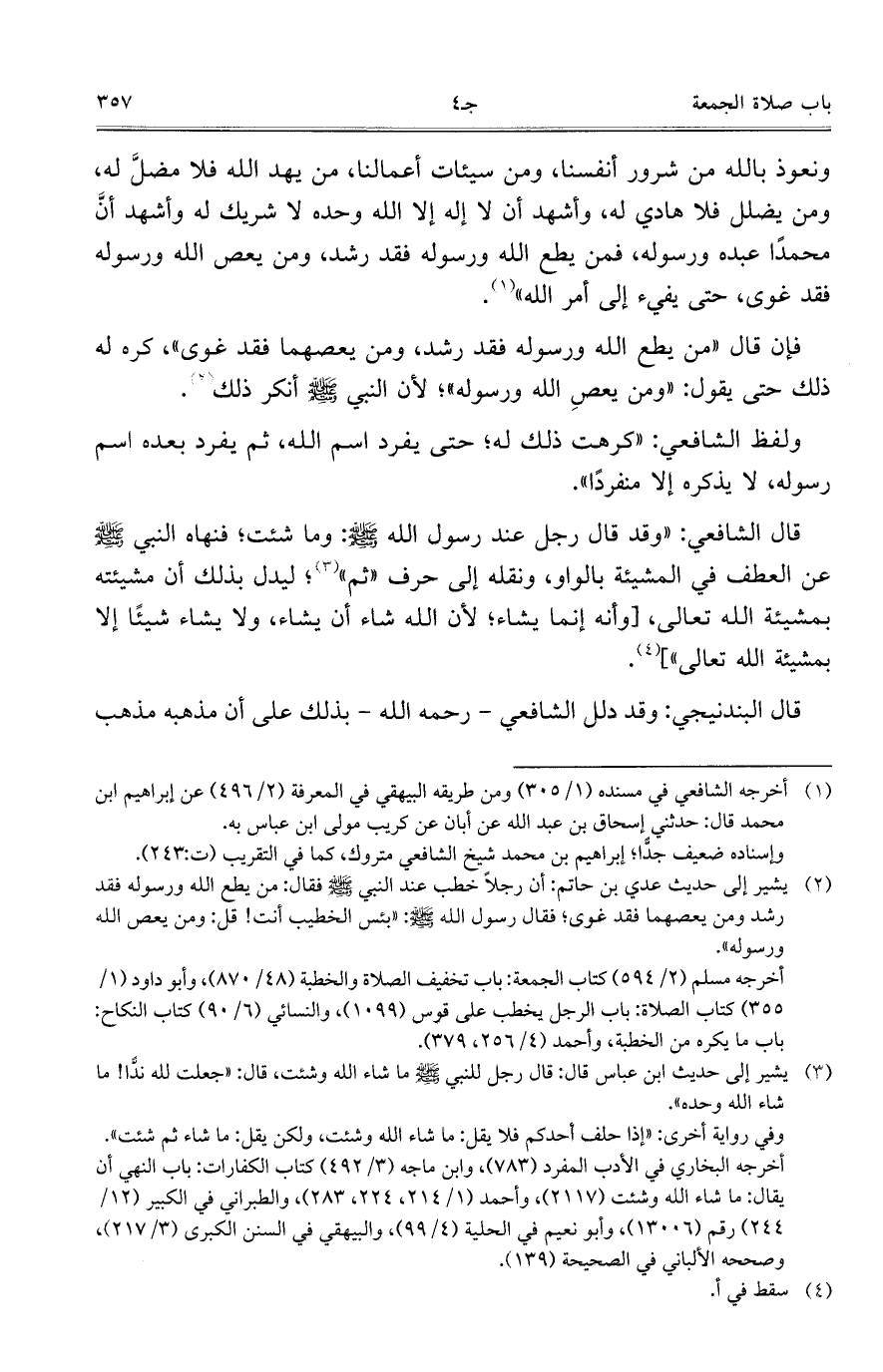 فإن قال "من يطع الله ورسوله فقد رشد، ومن يعصهما فقد غوى"، كره له ذلك حتى يقول: "ومن يعصِ الله ورسوله"؛ لأن النبي صلى الله عليه وسلم أنكر ذلك.