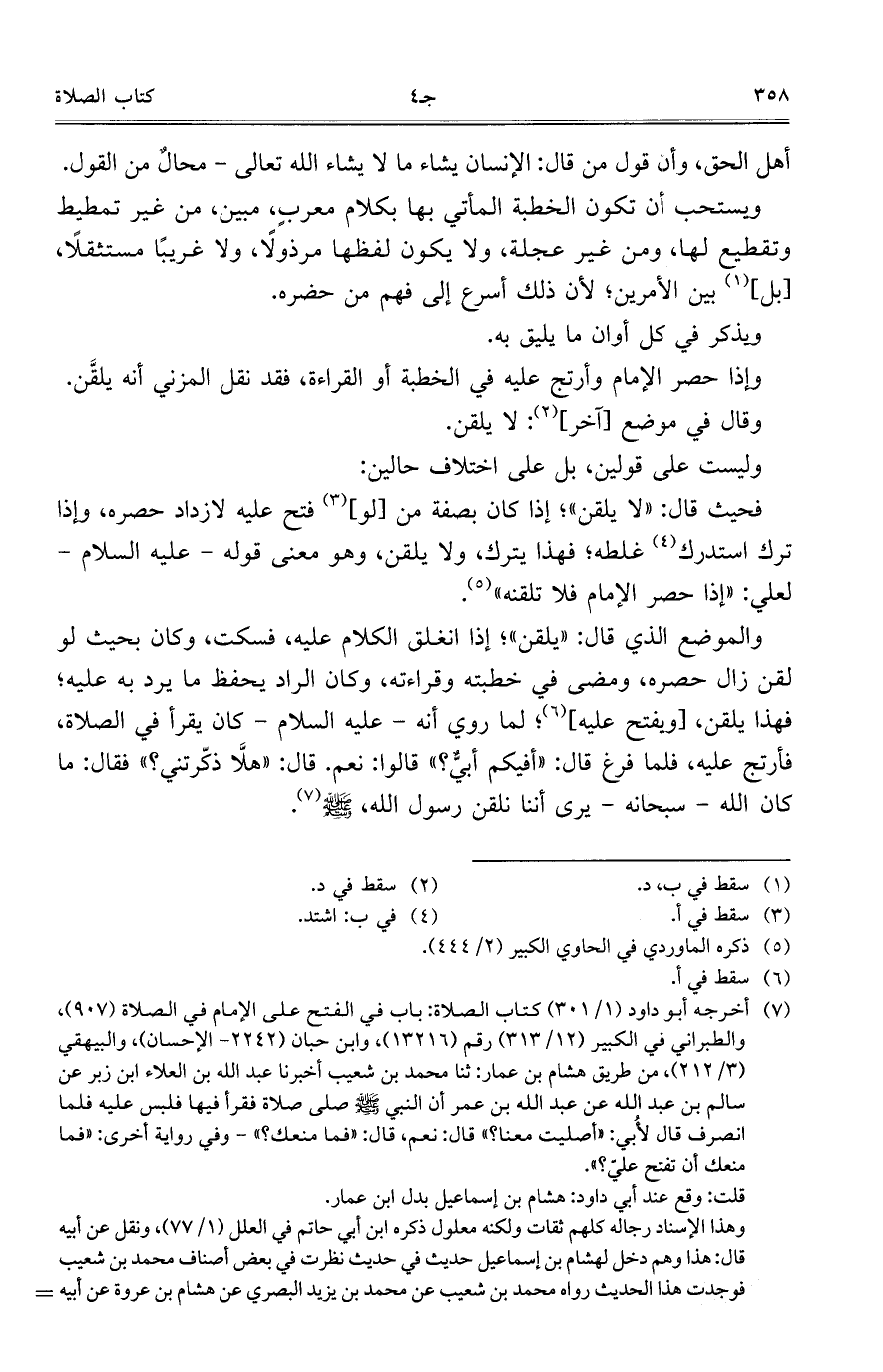 والموضع الذي قال: "يلقن"؛ إذا انغلق الكلام عليه، فسكت، وكان بحيث لو لقن زال حصره، ومضى في خطبته وقراءته، وكان الراد يحفظ ما يرد به عليه؛ فهذا يلقن، [ويفتح عليه]؛ لما روي أنه- عليه السلام- كان يقرأ في الصلاة، فأرتج عليه، فلما فرغ قال: "أفيكم أبيٌّ؟ " قالوا: نعم. قال: "هلَّا ذكّرتني؟ " فقال: ما كان الله- سبحانه- يرى أننا نلقن رسول الله صلى الله عليه وسلم.