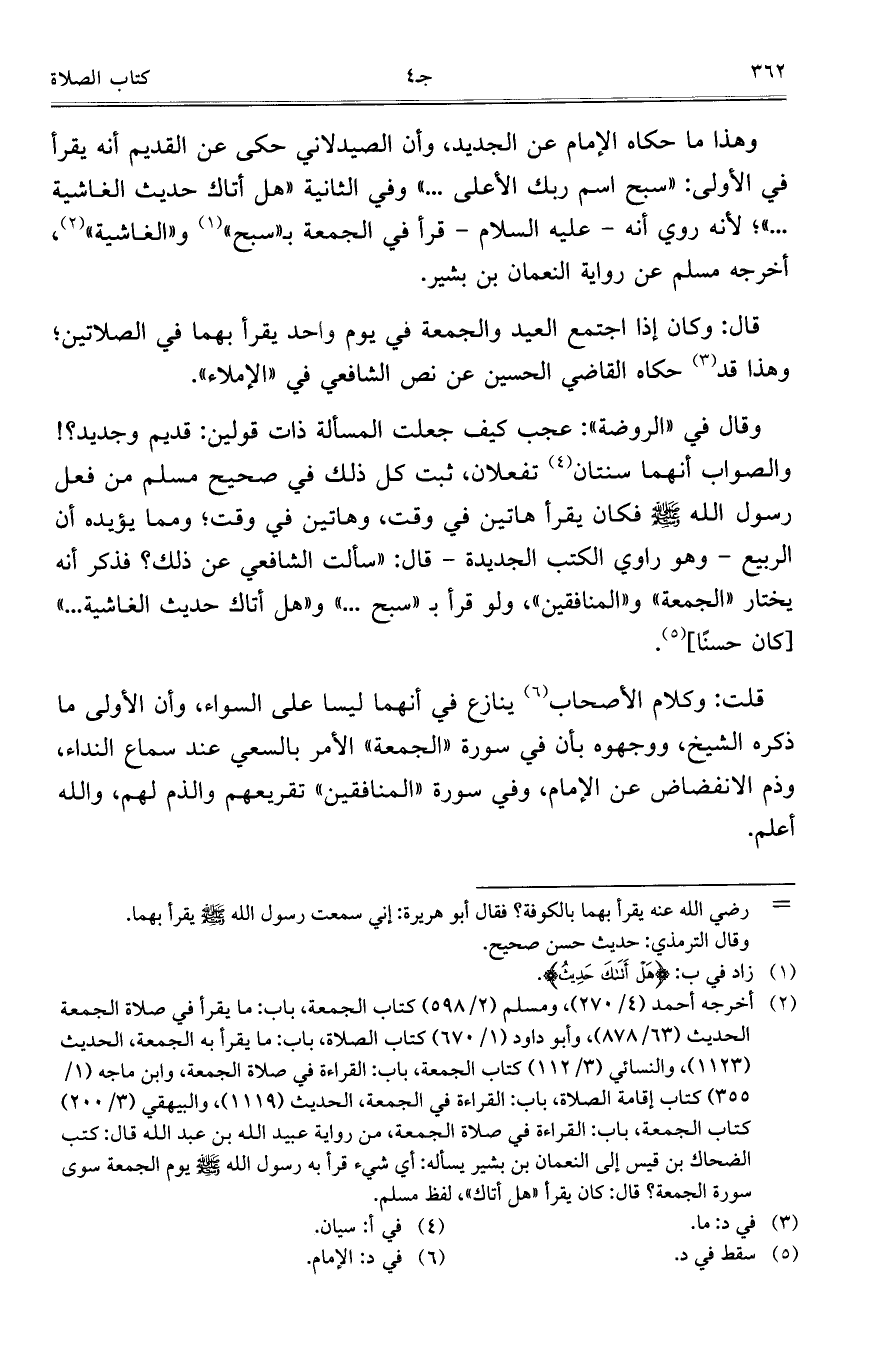 وقال في "الروضة": عجب كيف جعلت المسألة ذات قولين: قديم وجديد؟! والصواب أنهما سنتان تفعلان، ثبت كل ذلك في صحيح مسلم من فعل رسول الله صلى الله عليه وسلم فكان يقرأ هاتين في وقت، وهاتين في وقت؛ ومما يؤيده أن الربيع- وهو راوي الكتب الجديدة- قال: "سألت الشافعي عن ذلك؟ فذكر أنه يختار "الجمعة" و"المنافقين"، ولو قرأ بـ "سبح .. " و"هل أتاك حديث الغاشية .. " [كان حسناً].