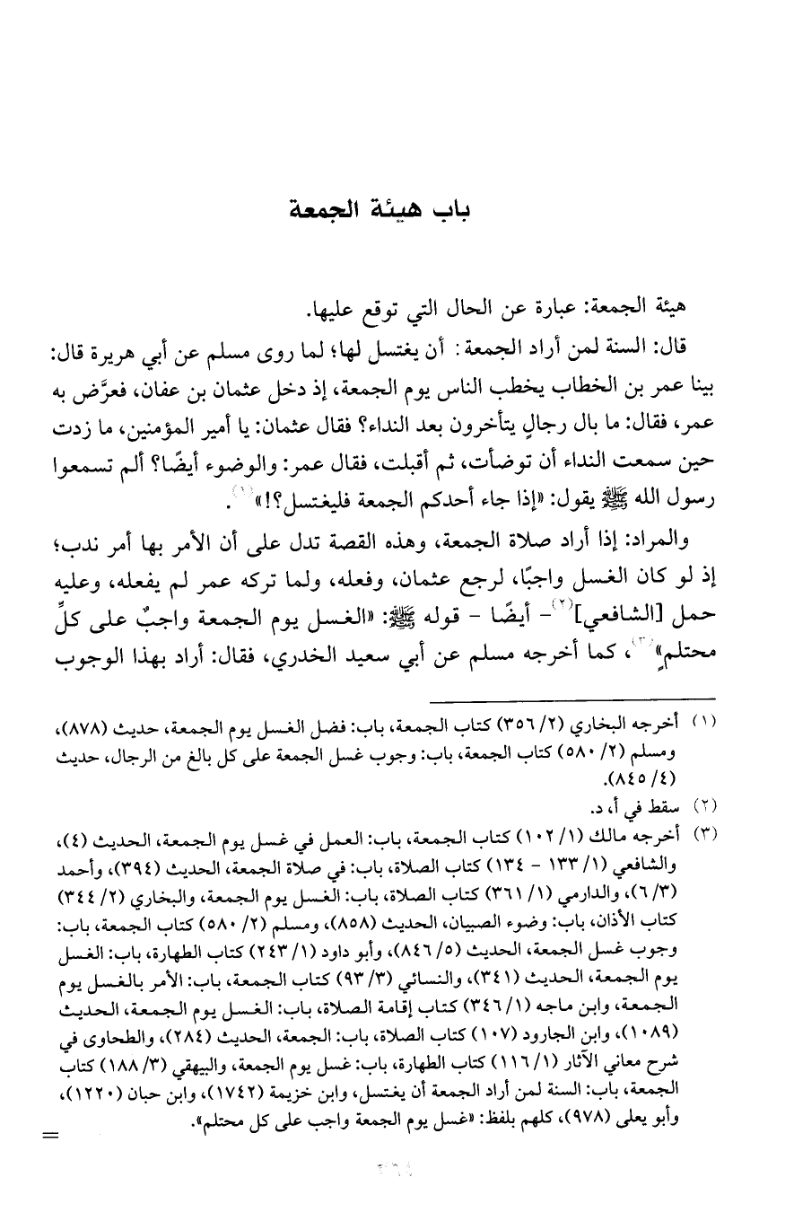قال: السنة لمن أراد الجمعة: أن يغتسل لها؛ لما روى مسلم عن أبي هريرة قال: بينا عمر بن الخطاب يخطب الناس يوم الجمعة، إذ دخل عثمان بن عفان، فعرَّض به عمر، فقال: ما بال رجالٍ يتأخرون بعد النداء؟ فقال عثمان: يا أمير المؤمنين، ما زدت حين سمعت النداء أن توضأت، ثم أقبلت، فقال عمر: والوضوء أيضاً؟ ألم تسمعوا رسول الله صلى الله عليه وسلم يقول: "إذا جاء أحدكم الجمعة فليغتسل؟! ".