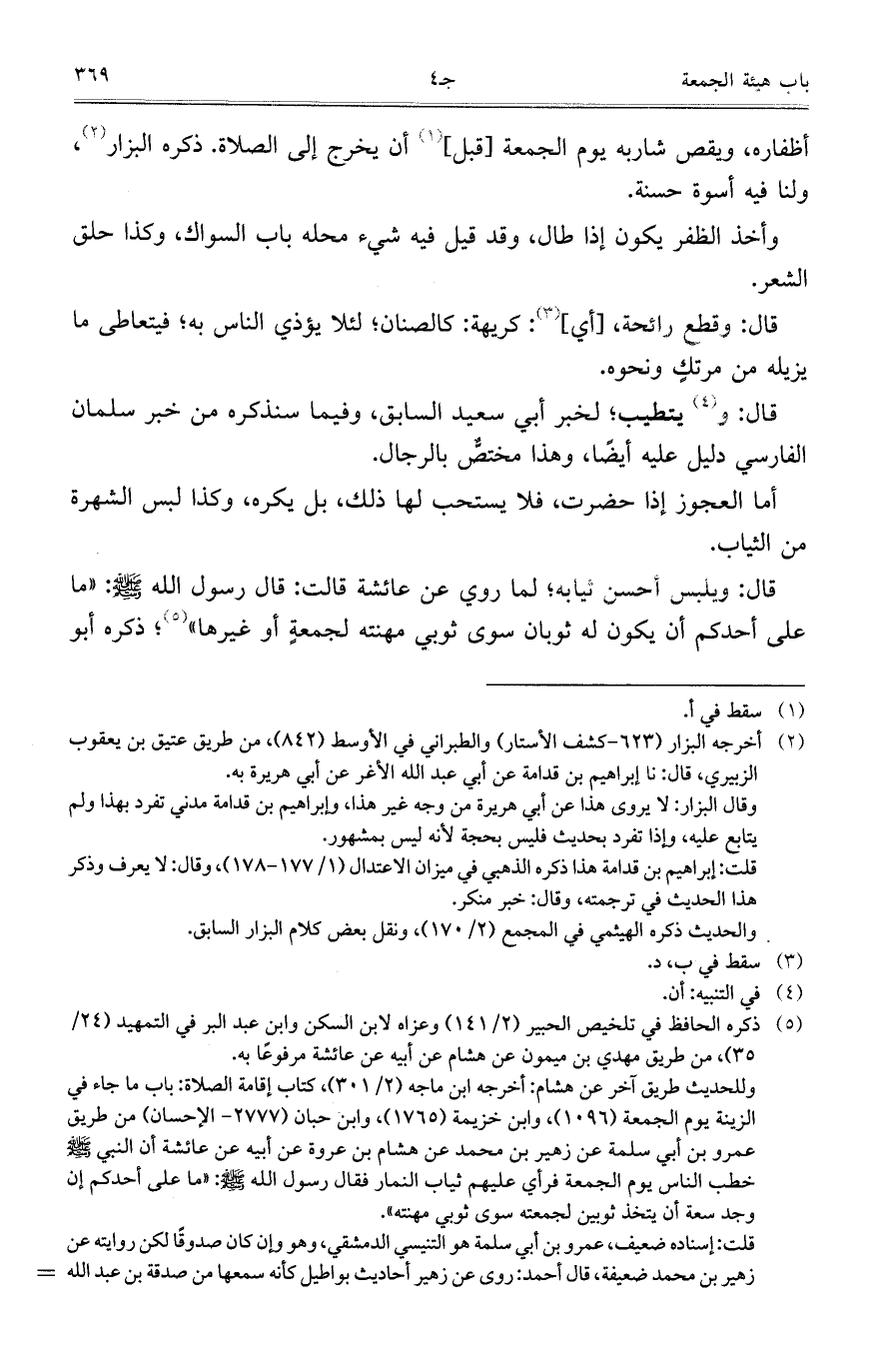 أظفاره، ويقص شاربه يوم الجمعة [قبل] أن يخرج إلى الصلاة. ذكره البزار، ولنا فيه أسوة حسنة.