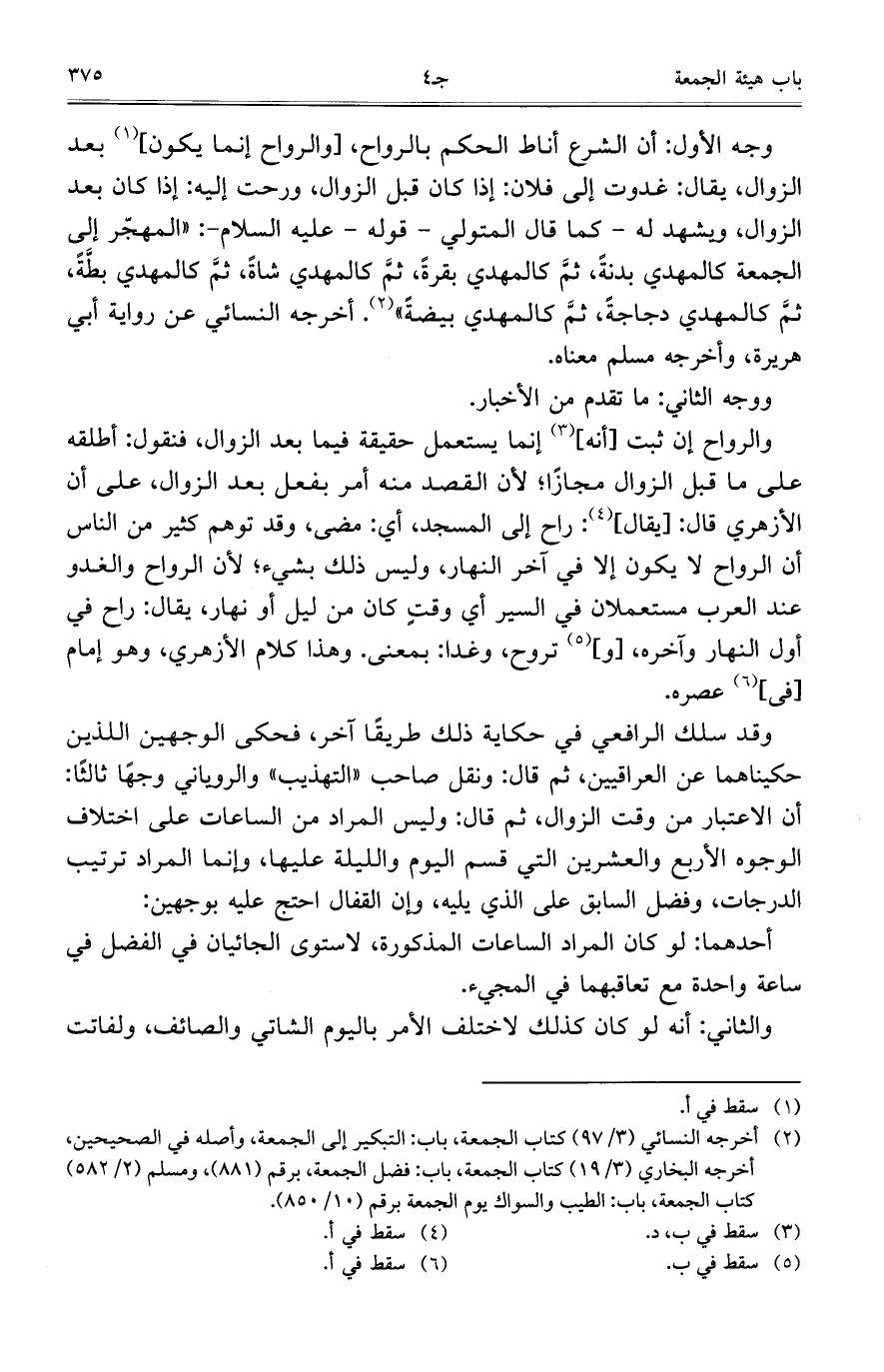 وجه الأول: أن الشرع أناط الحكم بالرواح، [والرواح إنما يكون] بعد الزوال، يقال: غدوت إلى فلان: إذا كان قبل الزوال، ورحت إليه: إذا كان بعد الزوال، ويشهد له- كما قال المتولي- قوله- عليه السلام-: "المهجّر إلى الجمعة كالمهدي بدنةً، ثمَّ كالمهدي بقرةً، ثمَّ كالمهدي شاةً، ثم كالمهدي شاةً، ثمَّ كالمهدي بطَّةً، ثمَّ كالمهدي دجاجةً، ثمَّ كالمهدي بيضةً". أخرجه النسائي عن رواية أبي هريرة، وأخرجه مسلم معناه.