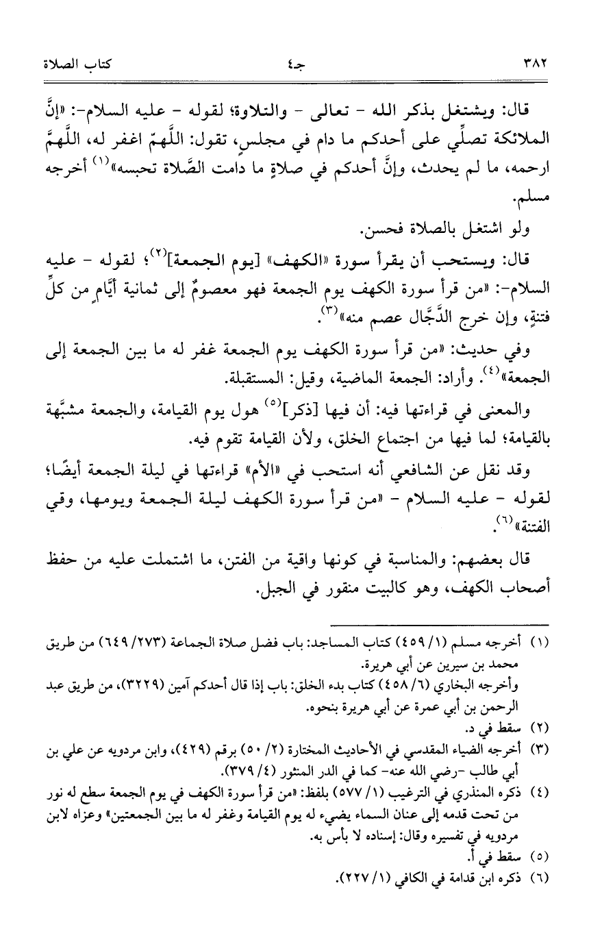 قال: ويستحب أن يقرأ سورة "الكهف" [يوم الجمعة]؛ لقوله- عليه السلام-: "من قرأ سورة الكهف يوم الجمعة فهو معصومٌ إلى ثمانية أيَّامٍ من كلِّ فتنةٍ، وإن خرج الدَّجَّال عصم منه".
