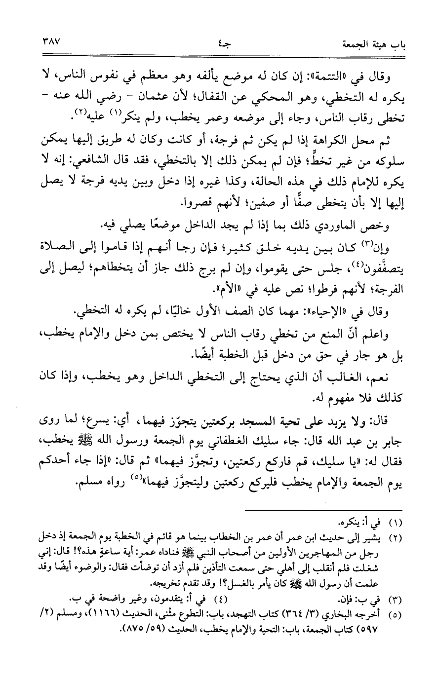 واعلم أنّ المنع من تخطي رقاب الناس لا يختص بمن دخل والإمام يخطب، بل هو جار في حق من دخل قبل الخطبة أيضاً.