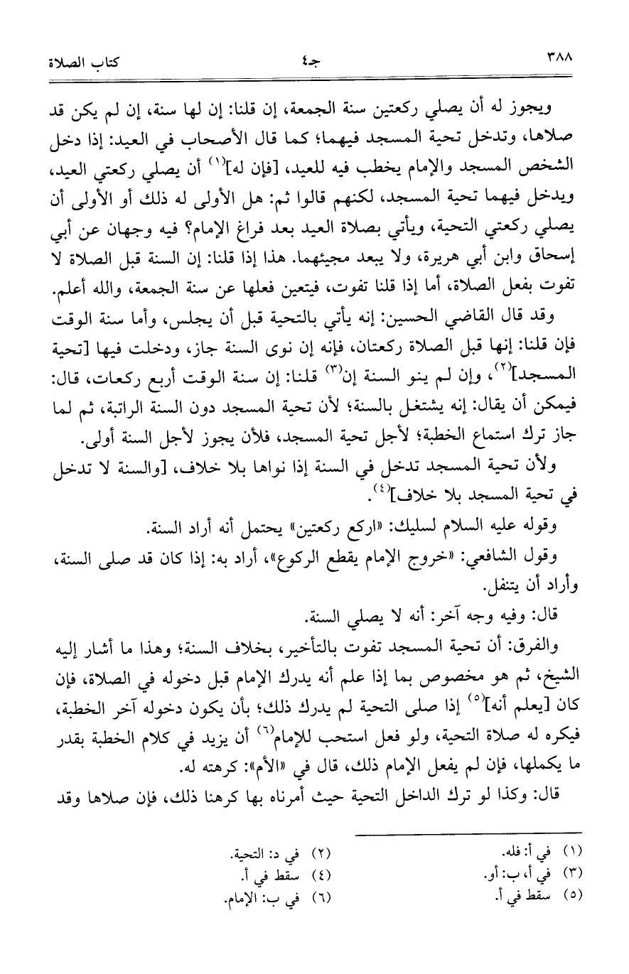وقد قال القاضي الحسين: إنه يأتي بالتحية قبل أن يجلس، وأما سنة الوقت فإن قلنا: إنها قبل الصلاة ركعتان، فإنه إن نوى السنة جاز، ودخلت فيها [تحية المسجد]، وإن لم ينو السنة إن قلنا: إن سنة الوقت أربع ركعات، قال: فيمكن أن يقال: إنه يشتغل بالسنة؛ لأن تحية المسجد دون السنة الراتبة، ثم لما جاز ترك استماع الخطبة؛ لأجل تحية المسجد، فلأن يجوز لأجل السنة أولى.