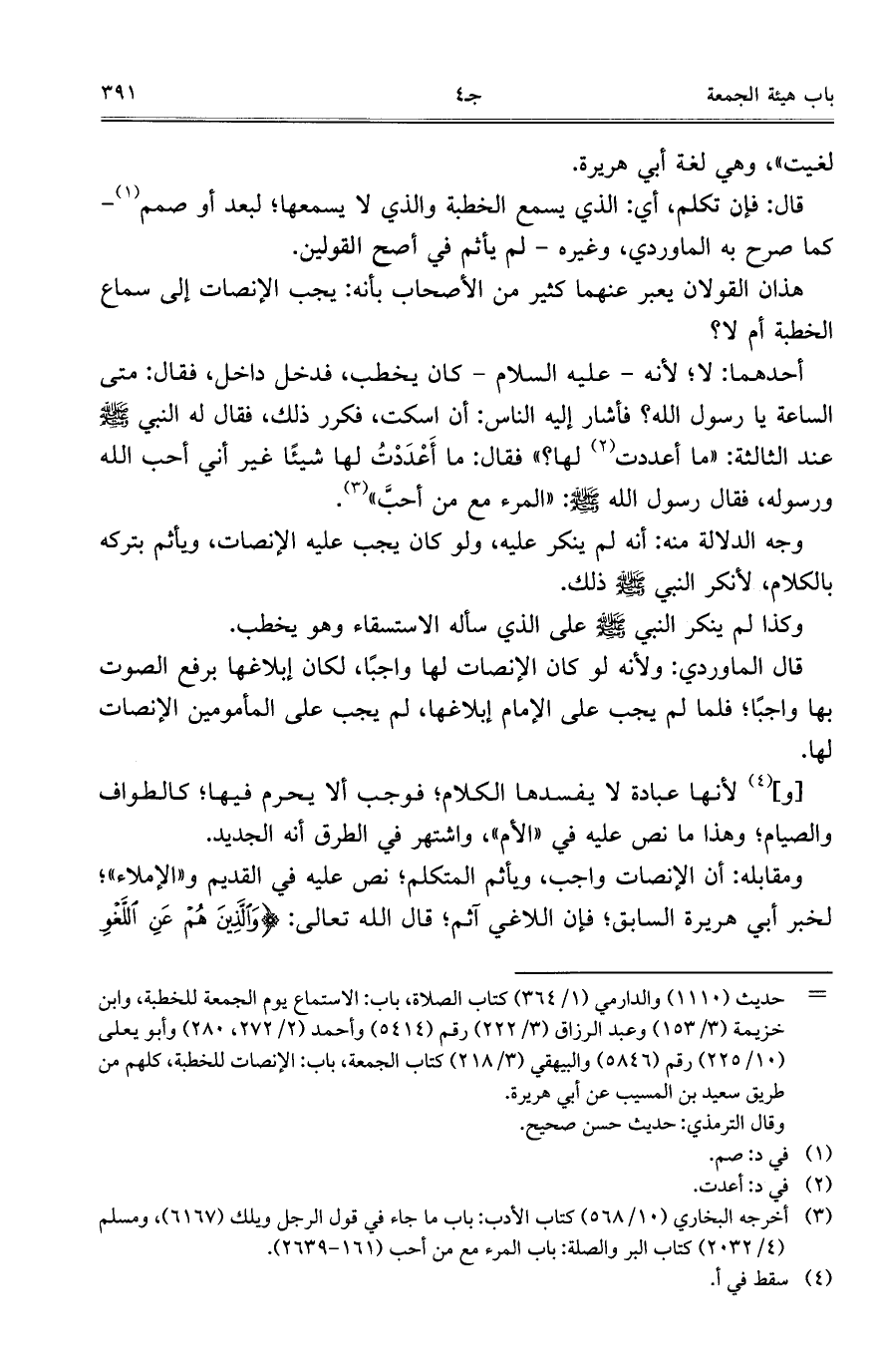 ومقابله: أن الإنصات واجب، ويأثم المتكلم؛ نص عليه في القديم و"الإملاء"؛ لخبر أبي هريرة السابق؛ فإن اللاغي آثم؛ قال الله تعالى: {وَالَّذِينَ هُمْ عَنْ اللَّغْوِ