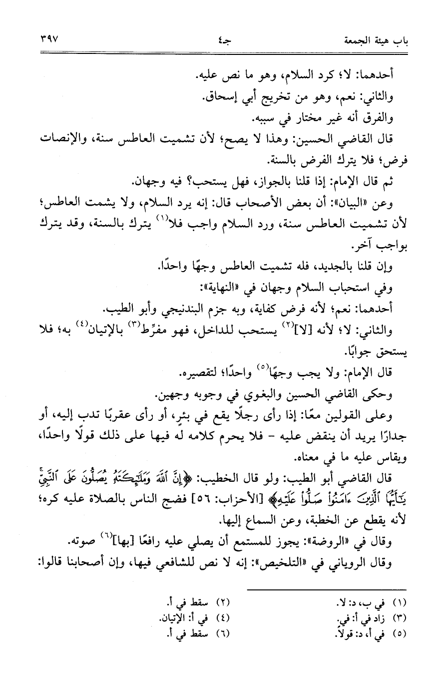 قال القاضي الحسين: وهذا لا يصح؛ لأنه تشميت العاطس سنة، والإنصات فرض؛ فلا يترك الفرض بالسنة.