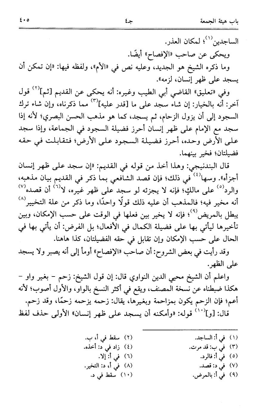 قال البندنيجي: وهذا أخذ من قوله في القديم: "إن سجد على ظهر إنسان أجزأه". وسها في ذلك؛ فإن قصد الشافعي بما ذكر في القديم بيان مذهبه، والرد على مالكٍ؛ فإنه لا يجزئه لو سجد على ظهر غيره، لا أن قصده أنه مخير فيه؛ فالمذهب أن عليه ذلك قولاً واحداً، وما ذكر من علة التخيير يبطل بالمريض؛ فإنه لا يخير بين فعلها في الوقت على حسب الإمكان، وبين تأخيرها ليأتي بها على فضيلة الكمال في الأفعال؛ بل الفرض: أن يأتي بها في الحال على حسب الإمكان وإن تقابل في حقه الفضيلتان، كذا ها هنا.