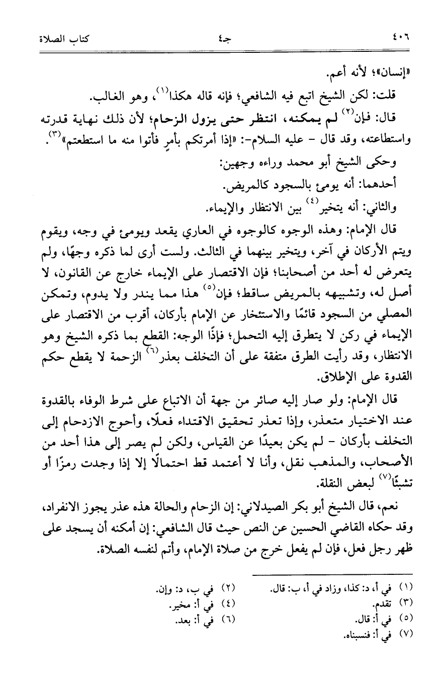 قال الإمام: وهذه الوجوه كالوجوه في العاري يقعد ويومئ في وجه، ويقوم ويتم الأركان في آخر، ويتخير بينهما في الثالث. ولست أرى لما ذكره وجهاً، ولم يتعرض له أحد من أصحابنا؛ فإن الاقتصار على الإيماء خارج عن القانون، لا أصل له، وتشبيهه بالمريض ساقط؛ فإن هذا مما يندر ولا يدوم، وتمكن المصلي من السجود قائماً والاستئخار عن الإمام بأركان، أقرب من الاقتصار على الإيماء في ركن لا يتطرق إليه التحمل؛ فإذاً الوجه: القطع بما ذكره الشيخ وهو الانتظار، وقد رأيت الطرق متفقة على أن التخلف بعذر الزحمة لا يقطع حكم القدوة على الإطلاق.