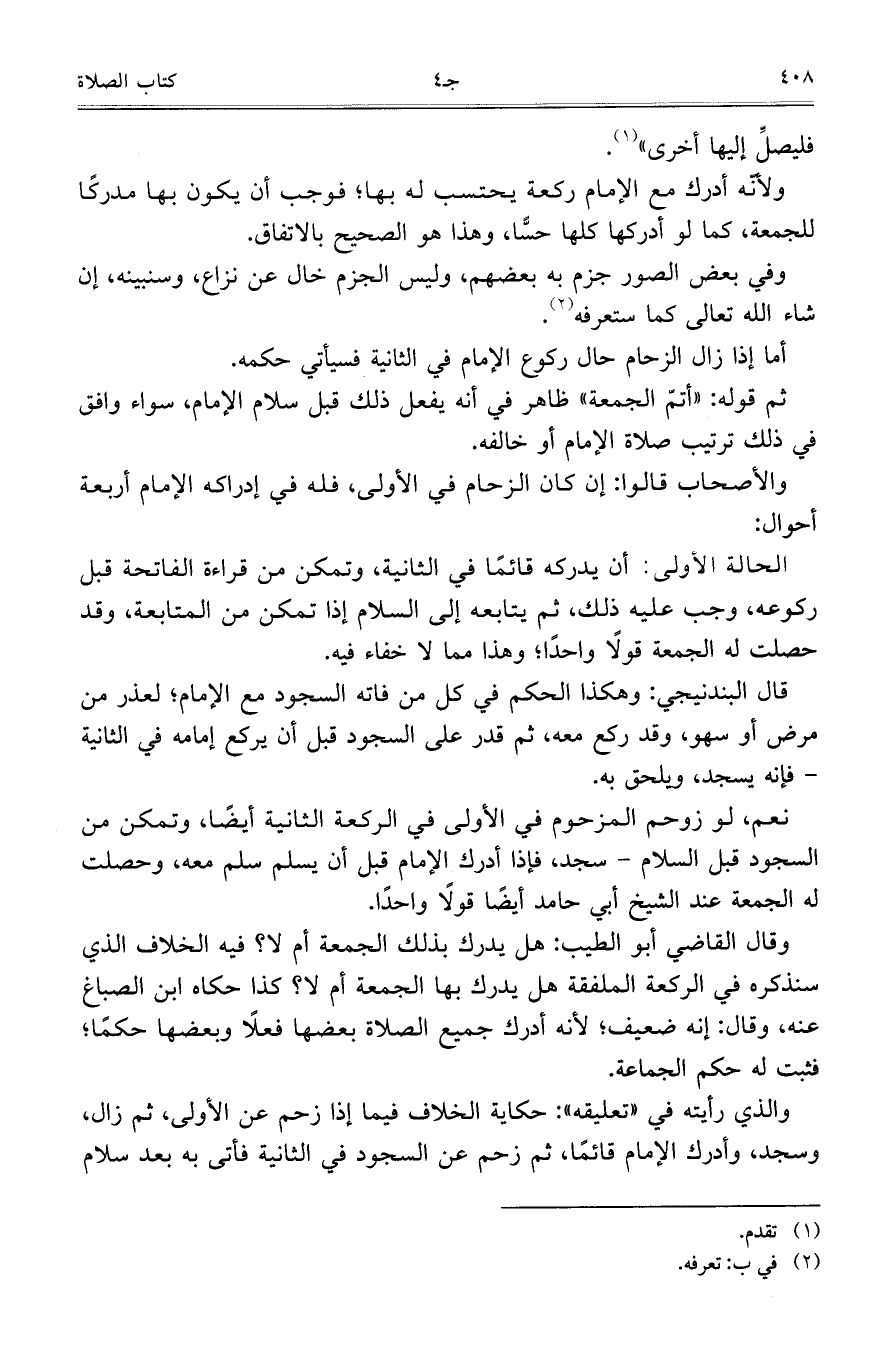 ثم قوله: "أتمّ الجمعة" ظاهر في أنه يفعل ذلك قبل سلام الإمام، سواء وافق في ذلك ترتيب صلاة الإمام أو خالفه.