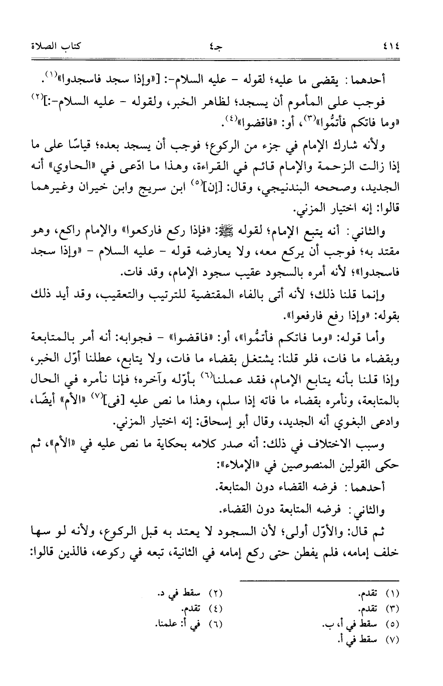 وأما قوله: "وما فاتكم فأتمُّوا"، أو: "فاقضوا"- فجوابه: أنه أمر بالمتابعة وبقضاء ما فات، فلو قلنا: يشتغل بقضاء ما فات، ولا يتابع، عطلنا أوّل الخبر، وإذا قلنا بأنه يتابع الإمام، فقد عملنا بأوّله وآخره؛ فإنا نأمره في الحال بالمتابعة، ونأمره بقضاء ما فاته إذا سلم، وهذا ما نص عليه [في] "الأم" أيضاً، وادعى البغوي أنه الجديد، وقال أبو إسحاق: إنه اختيار المزني.