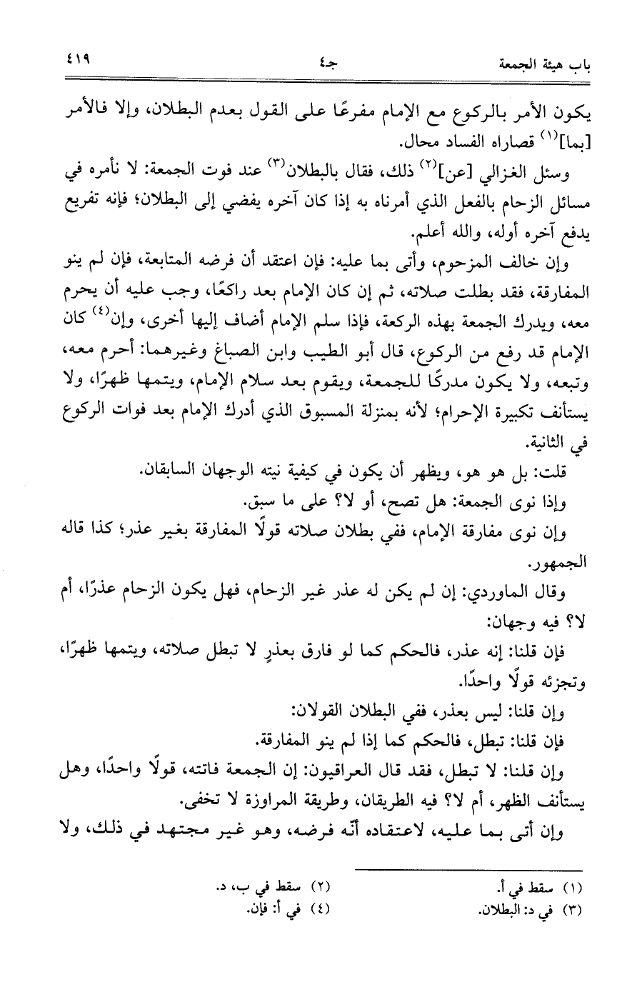 وسئل الغزالي [عن] ذلك، فقال بالبطلان عند فوت الجمعة: لا نأمره في مسائل الزحام بالفعل الذي أمرناه به إذا كان آخره يفضي إلى البطلان؛ فإنه تفريع يدفع آخره أوله، والله أعلم.