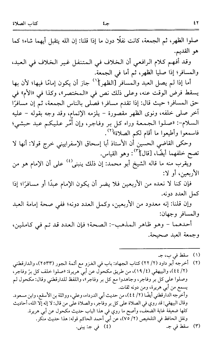 أما إذا لم يمل العيد والمسافر [الظهر] جاز أن يكون إماماً فيها؛ لأن بها يسقط فرض الوقت عنه، وعلى ذلك نص في "المختصر"، وكذا في "الأم" في حق المسافر؛ حيث قال: إذا تقدم مسافر؛ فصلى بالناس الجمعة، ثم إن مسافراً آخر صلى خلفه، ونوى الظهر مقصورة - يلزمه الإتمام، وقد وجه بقوله – عليه السلام-: "صلوا الجمعة وراء كل بر وفاجر، وإن أُمِّر عليكم عبد حبشي؛ فاسمعوا وأطيعوا ما أقام لكم الصلاة".