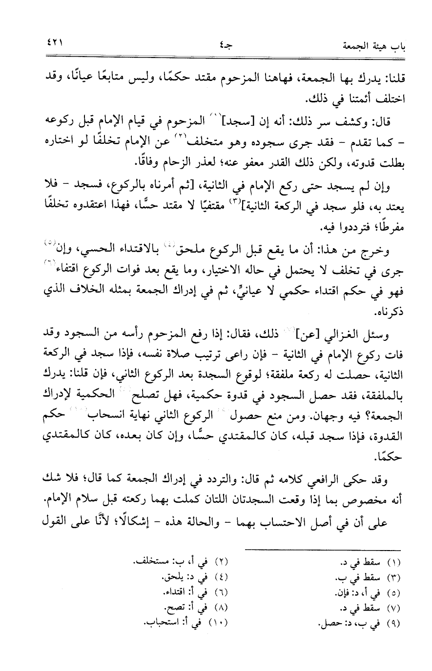 وسئل الغزالي [عن] ذلك، فقال: إذا رفع المزحوم رأسه من السجود وقد فات ركوع الإمام في الثانية- فإن راعى ترتيب صلاة نفسه، فإذا سجد في الركعة الثانية، حصلت له ركعة ملفقة؛ لوقوع السجدة بعد الركوع الثاني، فإن قلنا: يدرك بالملفقة، فقد حصل السجود في قدوة حكمية، فهل تصلح الحكمية لإدراك الجمعة؟ فيه وجهان. ومن منع حصول الركوع الثاني نهاية انسحاب حكم القدوة، فإذا سجد قبله، كان كالمقتدي حسّاً، وإن كان بعده، كان كالمقتدي حكماً.