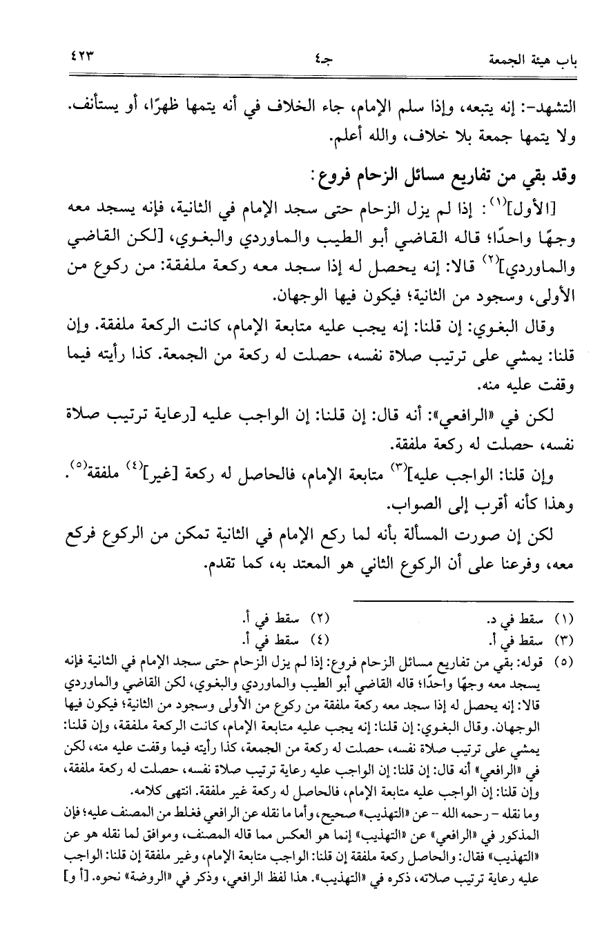 وقال البغوي: إن قلنا: إنه يجب عليه متابعة الإمام، كانت الركعة ملفقة. وإن قلنا: يمشي على ترتيب صلاة نفسه، حصلت له ركعة من الجمعة. كذا رأيته فيما وقفت عليه منه.