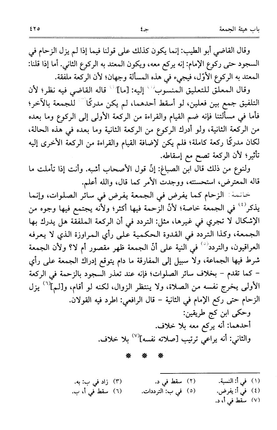 وقال المعلق للتعليق المنسوب إليه: [ما] قاله القاضي فيه نظر؛ لأن التلفيق جمع بين فعلين، لو أسقط أحدهما، لم يكن مدركاً للجمعة بالآخر؛ فأما في مسألتنا فإنه ضم القيام والقراءة من الركعة الأولى إلى الركوع وما بعده من الركعة الثانية، ولو أدرك الركوع من الركعة الثانية وما بعده في هذه الحالة، لكان مدركاً ركعة كاملة؛ فلم يكن لإضافة القيام والقراءة من الركعة الأخرى إليه تأثير؛ لأن الركعة تصح مع إسقاطه.