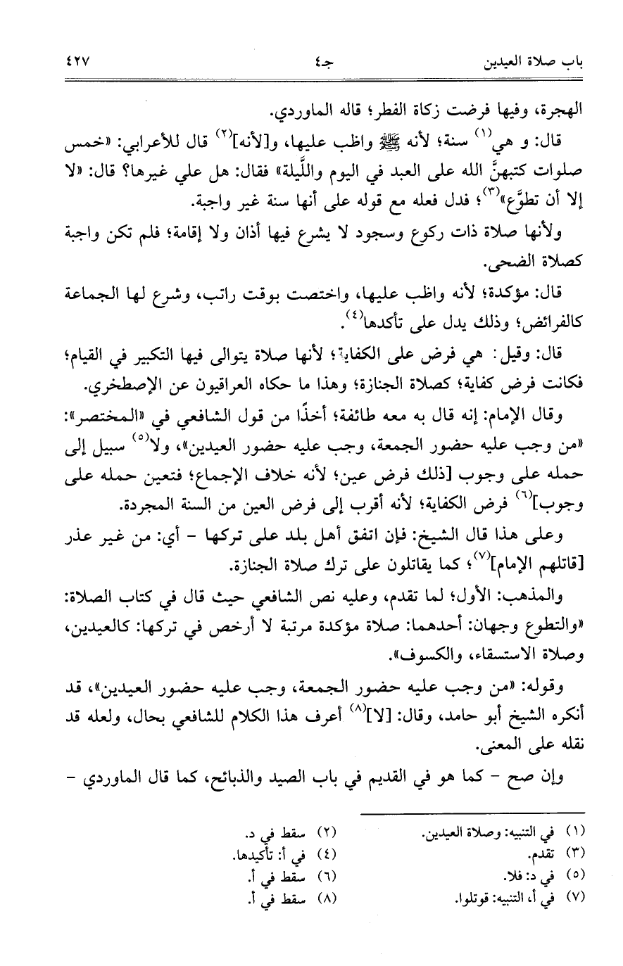 وقوله: "نم وجب عليه حضور الجمعة، وجب عليه حضور العيدين"، قد أنكره الشيخ أبو حامد، وقال: [لا] أعرف هذا الكلام للشافعي بحال، ولعله قد نقله على المعنى.
