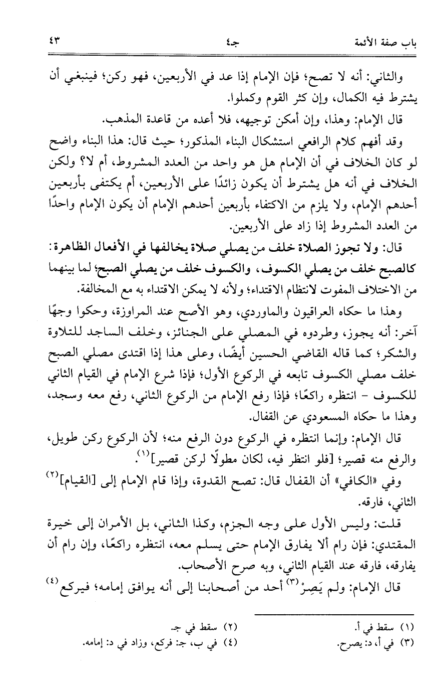 وقد أفهم كلام الرافعي استشكال البناء المذكور؛ حيث قال: هذا البناء واضح لو كان الخلاف في أن الإمام هل هو واحد من العدد المشروط، أم لا؟ ولكن الخلاف في أنه هل يشترط أن يكون زائداً على الأربعين، أم يكتفى بأربعين أحدهم الإمام، ولا يلزم من الاكتفاء بأربعين أحدهم الإمام أن يكون الإمام واحداً من العدد المشروط إذا زاد على الأربعين.