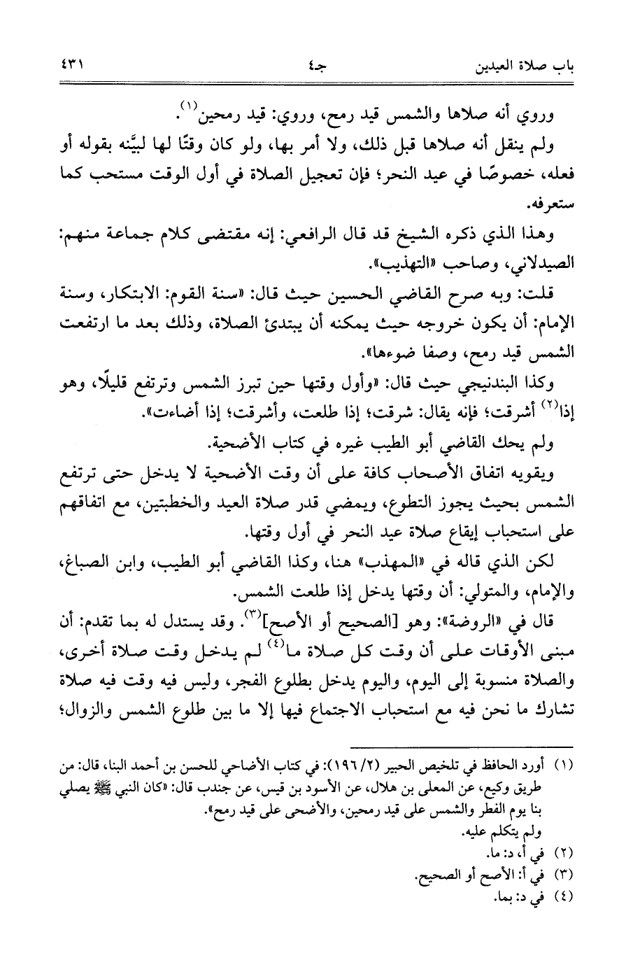 قلت: وبه صرح القاضي الحسين حيث قال: "سنة القوم: الابتكار، وسنة الإمام: أن يكون خروجه حيث يمكنه أن يبتدئ الصلاة، وذلك بعد ما ارتفعت الشمس قيد رمح، وصفا ضوءها".