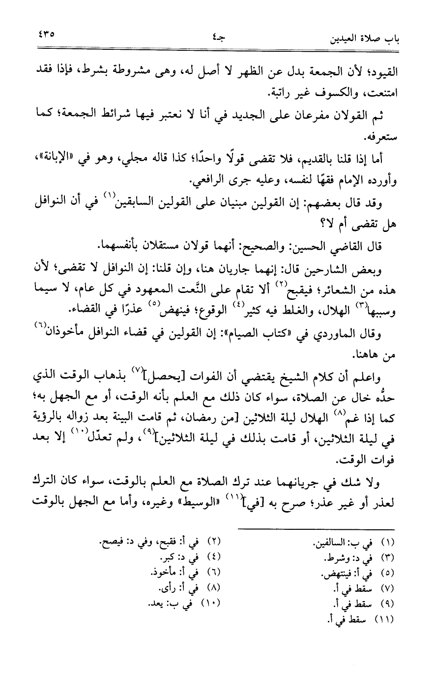 وبعض الشارحين قال: إنهما جاريان هنا، وإن قلنا: إن النوافل لا تقضى؛ لأن هذه من الشعائر؛ فيقبح ألا تقام على النَّعت المعهود في كل عام، لاسيما وسببها الهلال، والغلط فيه كثير الوقوع؛ فينهض عذراً في القضاء.