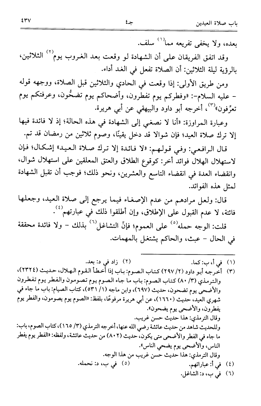 ومن طريق الأولى: إذا وقعت في الحادي والثلاثين قبل الصلاة، ووجهه قوله- عليه السلام-: "وفطركم يوم تفطرون، وأضحاكم يوم تضحُّون، وعرفتكم يوم تعرِّفون"، أخرجه أبو داود والبيهقي عن أبي هريرة.