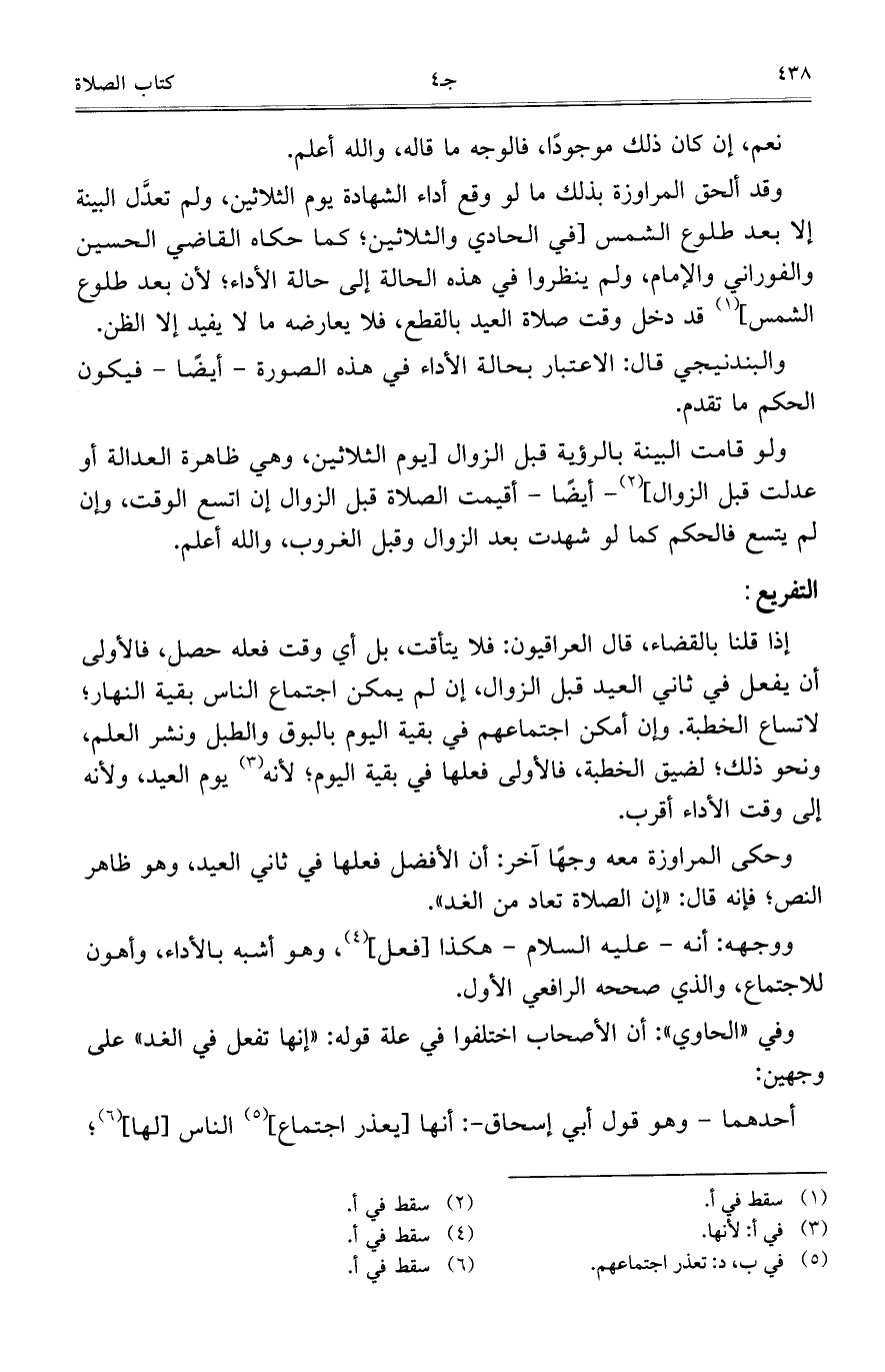 إذا قلنا بالقضاء، قال العراقيون: فلا يتأقت، بل أي وقت فعله حصل، فالأولى أن يفعل في ثاني العيد قبل الزوال، إن لم يمكن اجتماع الناس بقية النهار؛ لاتساع الخطبة. وإن أمكن اجتماعهم في بقية اليوم بالبوق والطبل ونشر العلم، ونحو ذلك؛ لضيق الخطبة، فالأولى فعلها في بقية اليوم؛ لأنه يوم العيد، ولأنه إلى وقت الأداء أقرب.