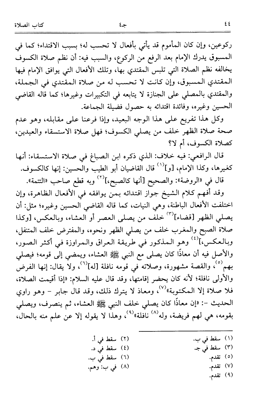 ركوعين، وإن كان المأموم قد يأتي بأفعال لا تحسب له؛ يسبب الاقتداء؛ كما في المسبوق يدرك الإمام بعد الرفع من الركوع، والسبب فيه: أن نظم صلاة الكسوف يخالفه نظم الصلاة التي تلبس المقتدي بها، وتلك الأفعال التي يوافق الإمام فيها المقتدي المسبوق، وإن كانت لا تحسب له من صلاة المقتدي في الجملة، والمقتدي بالمصلي على الجنازة لا يتابعه في التكبيرات وغيرها؛ كما قاله القاضي الحسين وغيره، وفائدة اقتدائه به حصول فضيلة الجماعة.