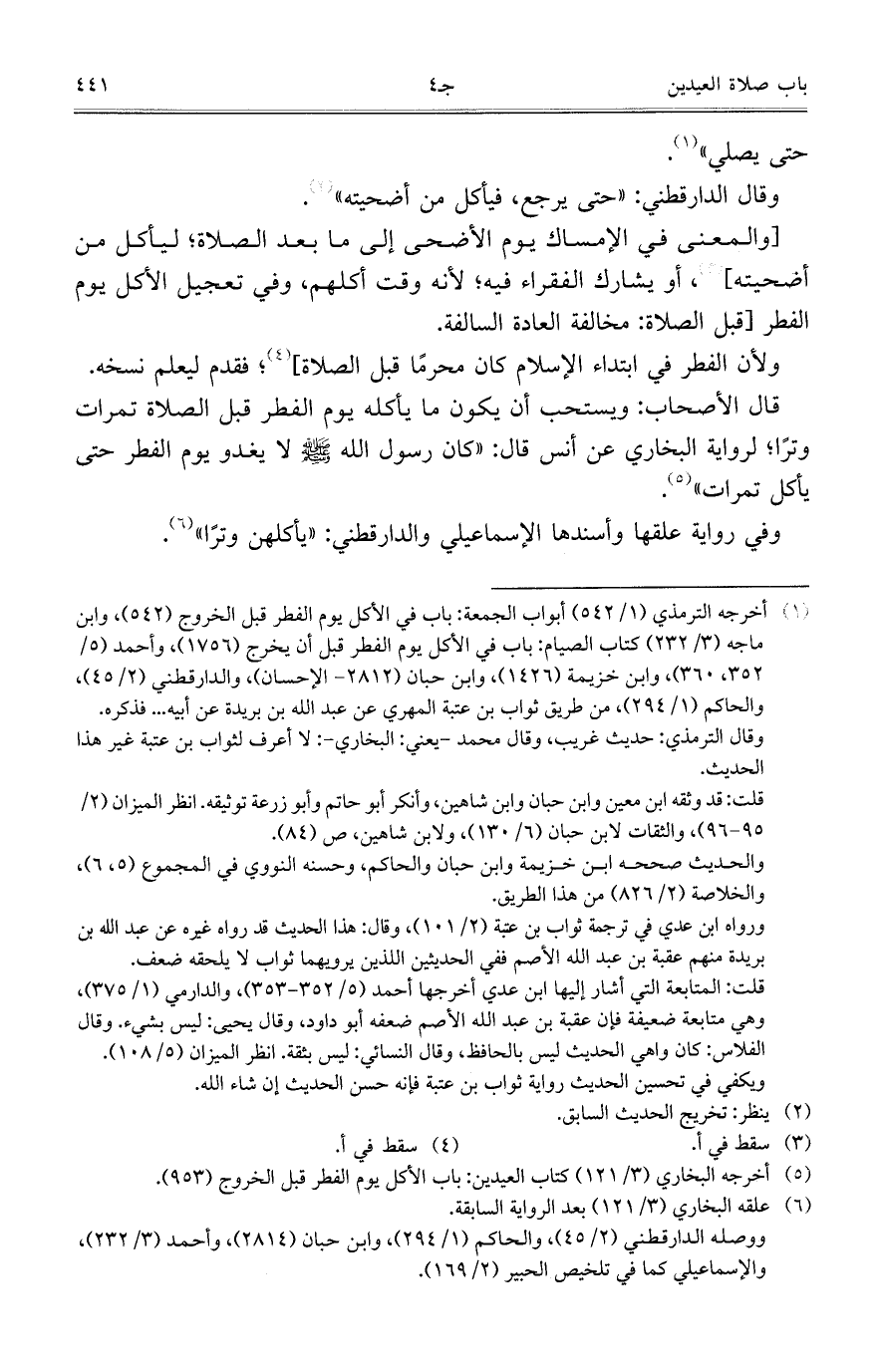 وقال الدارقطني: "حتى يرجع، فيأكل من أضحيته".