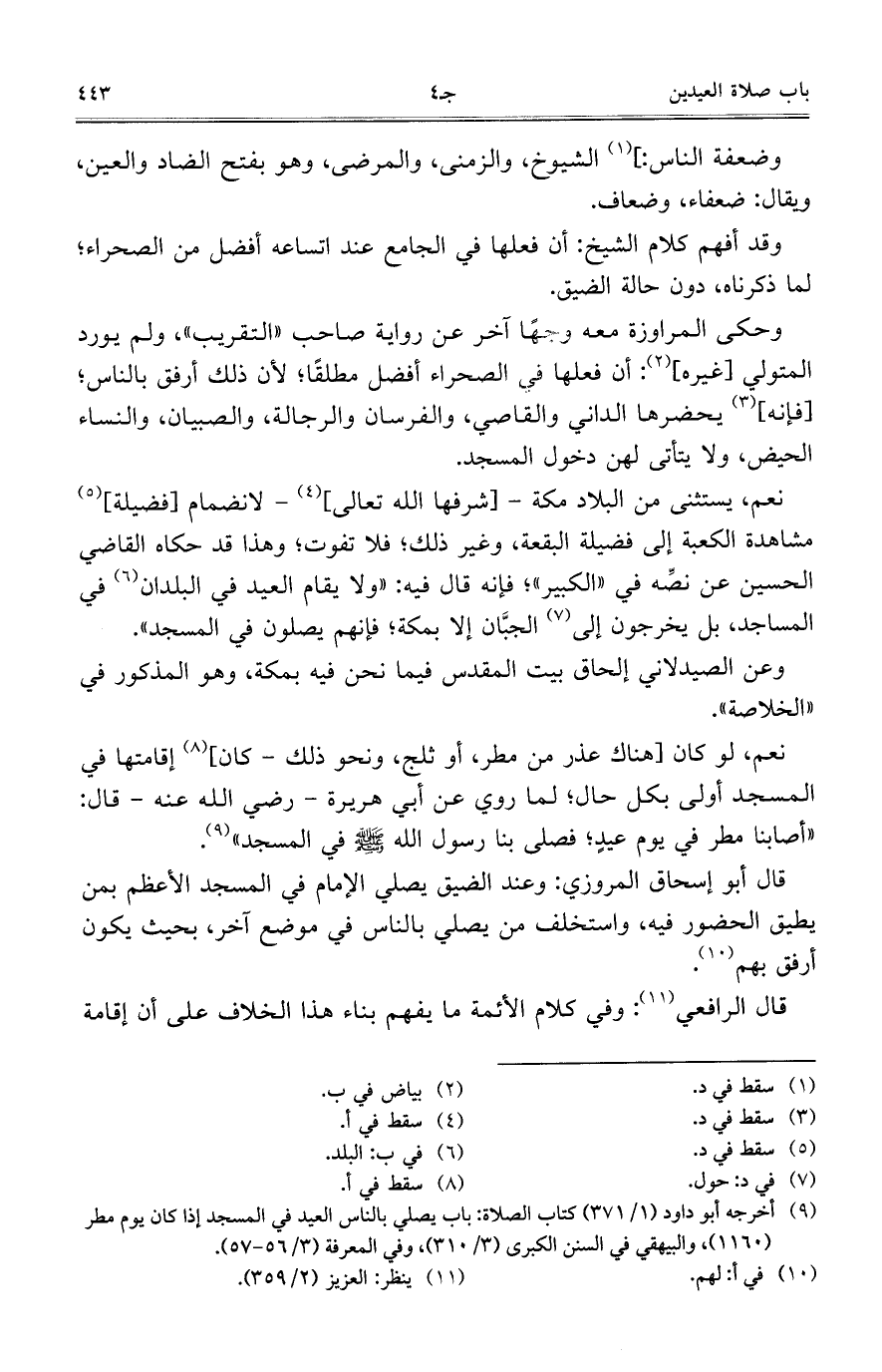 وحكى المراوزة معه وجهاً آخر عن رواية صاحب "التقريب"، ولم يورد المتولي [غيره]: أن فعلها في الصحراء أفضل مطلقاً؛ لأن ذلك أرفق بالناس؛ [فإنه] يحضرها الداني والقاصي، والفرسان والرجالة، والصبيان، والنساء الحيض، ولا يتأتى لهن دخول المسجد.