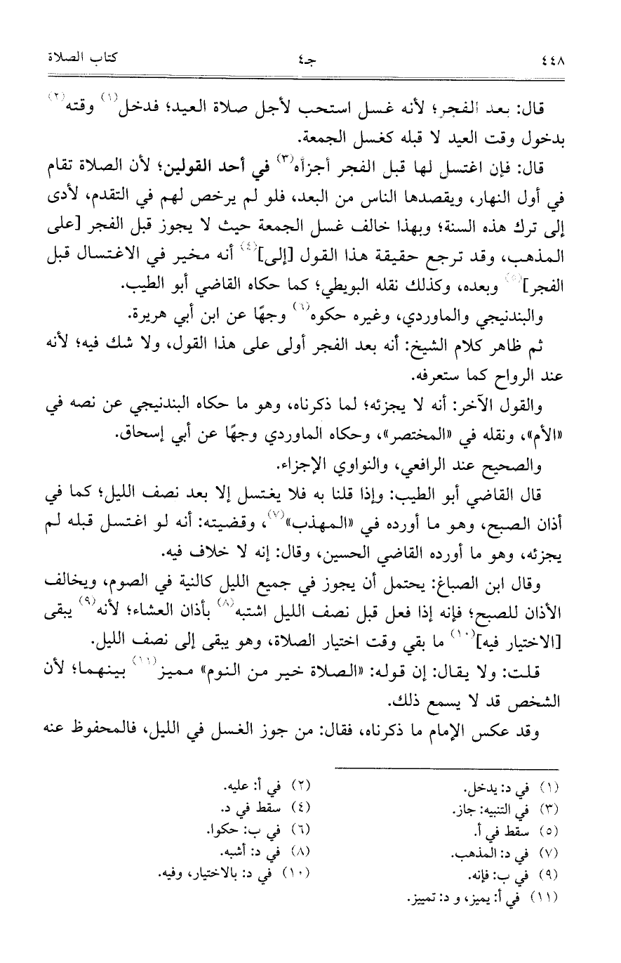 قال: فإن اغتسل لها قبل الفجر أجزأه في أحد القولين؛ لأن الصلاة تقام في أول النهار، ويقصدها الناس من البعد، فلو لم يرخص لهم في التقدم، لأدى إلى ترك هذه السنة؛ وبهذا خالف غسل الجمعة حيث لا يجوز قبل الفجر [على المذهب، وقد ترجع حقيقة هذا القول [إلى] أنه مخير في الاغتسال قبل الفجر] وبعده، وكذلك نقله البويطي؛ كما حكاه القاضي أبو الطيب.