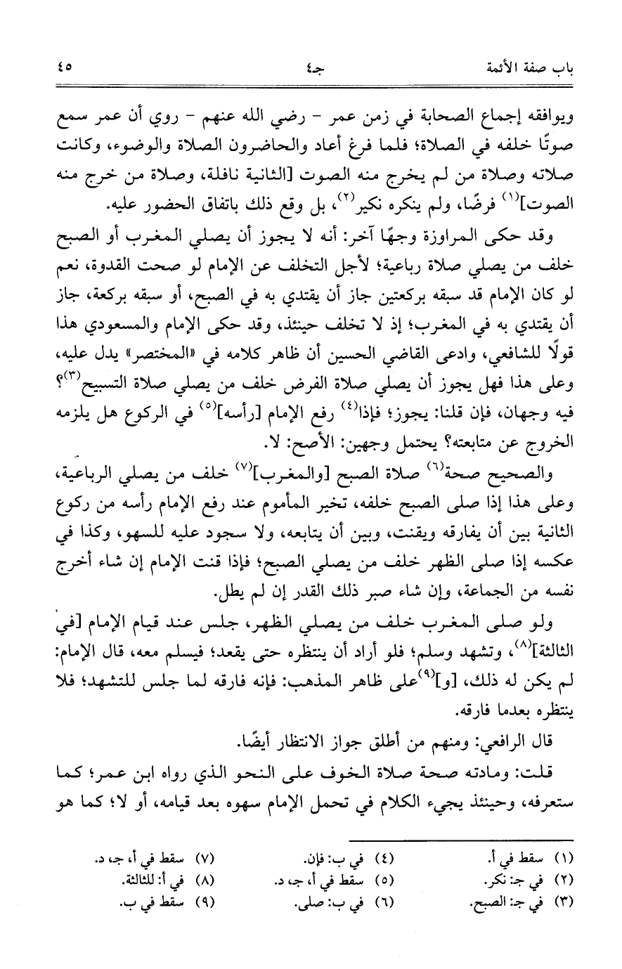 والصحيح صحة صلاة الصبح [والمغرب] خلف من يصلي الرباعية، وعلى هذا إذا صلى الصبح خلفه، تخير المأموم عند رفع الإمام رأسه من ركوع الثانية بين أن يفارقه ويقنت، وبين أن يتابعه، ولا محجوب عليه للسهو، وكذا في عكسه إذا صلى الظهر خلف من يصلي الصبح؛ فإذا قنت الإمام إن شاء أخرج نفسه من الجماعة، وإن شاء صبر ذلك القدر إن لم يطل.