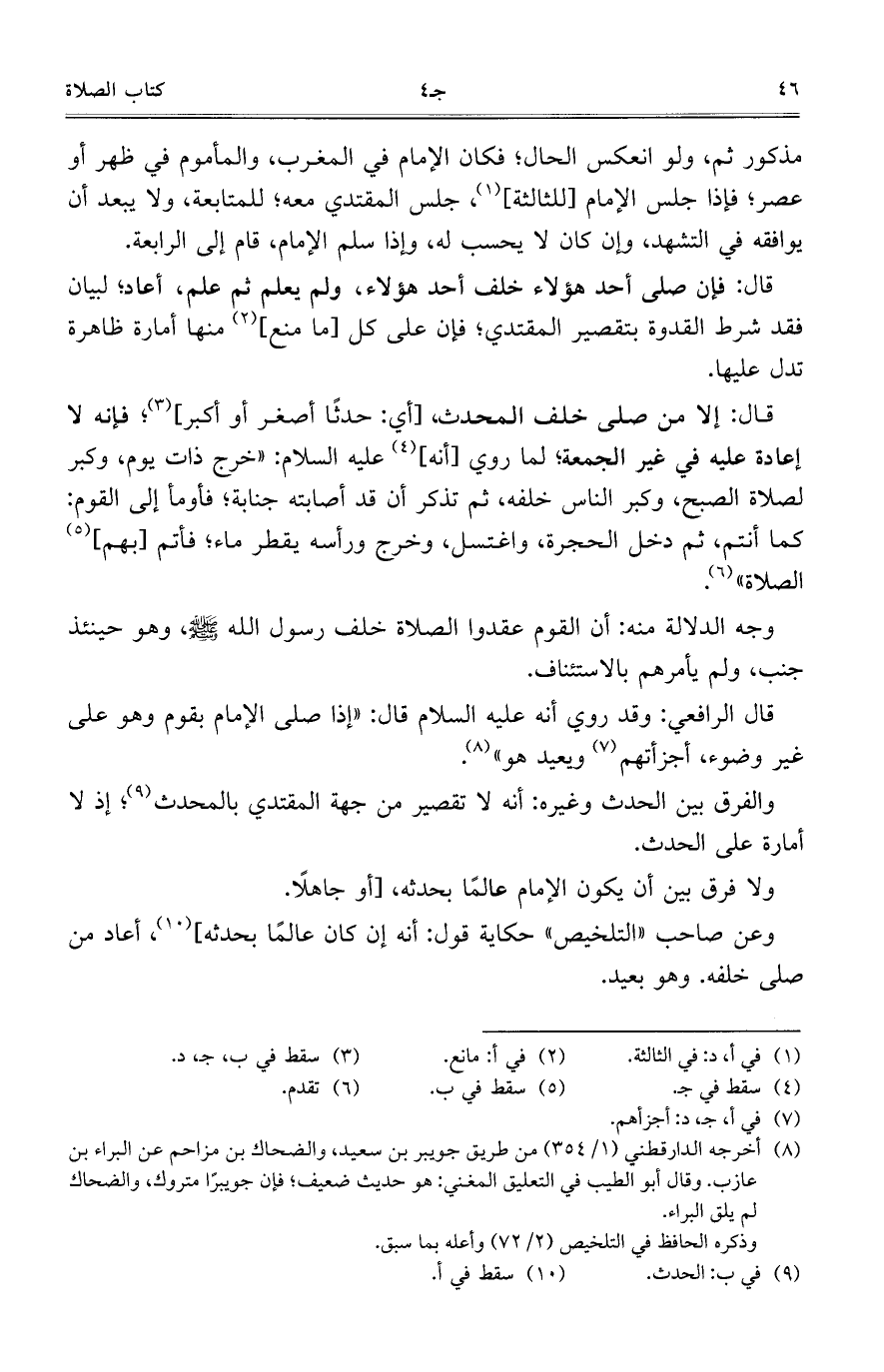 قال: إلا من صلى خلف المحدث، [أي: حدثاً أصغر أو أكبر]؛ فإنه لا إعادة عليه في غير الجمعة؛ لما روي [أنه] عليه السلام: "خرج ذات يوم، وكبر لصلاة الصبح، وكبر الناس خلفه، ثم تذكر أن قد أصابته جنابة؛ فأومأ إلى القوم: كما أنتم، ثم دخل الحجرة، واغتسل، وخرج ورأسه يقطر ماء؛ فأتم [بهم] الصلاة"0