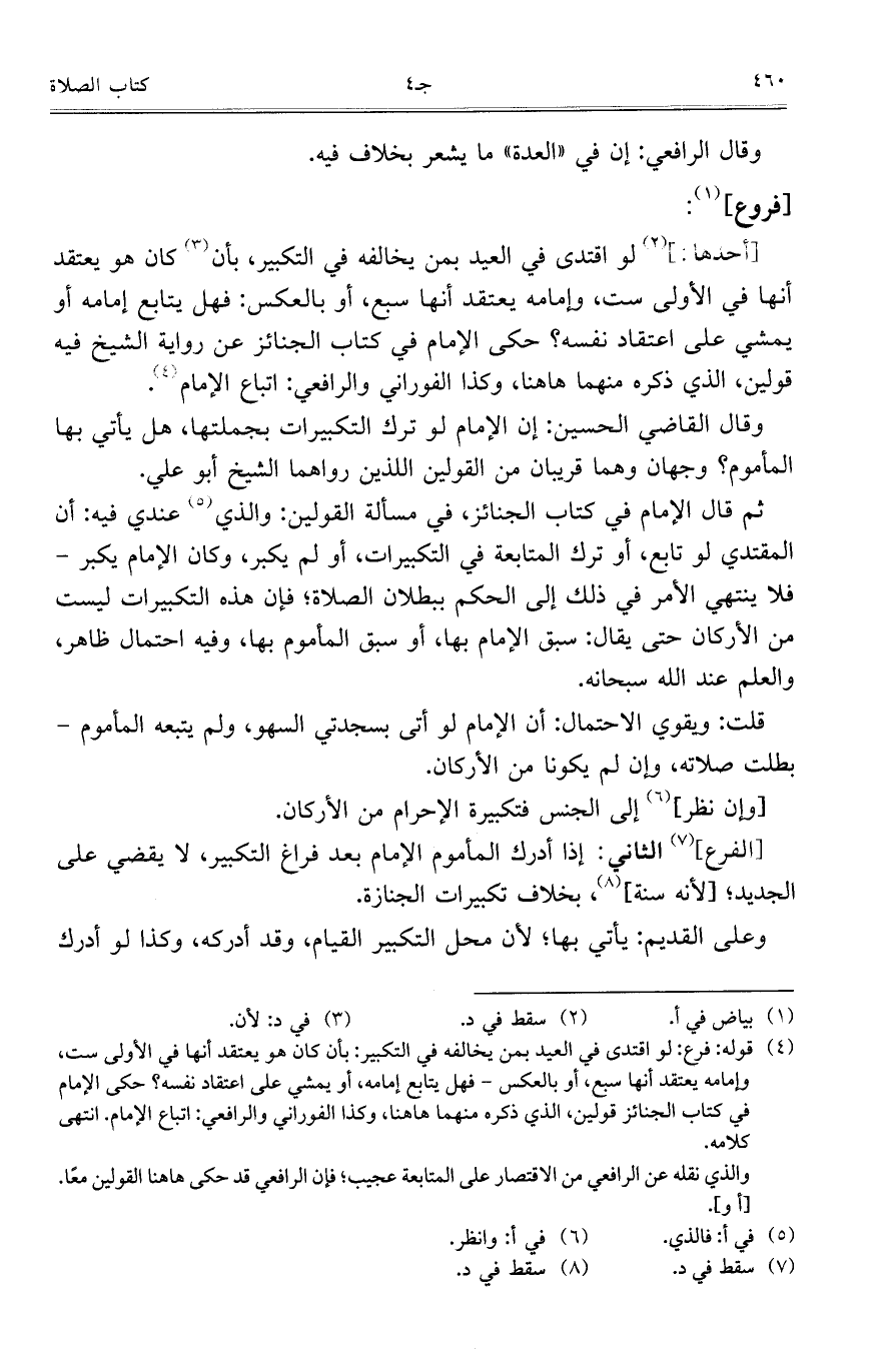 [أحدها:] لو اقتدى في العيد بمن يخالفه في التكبير، بأن كان هو يعتقد أنها في الأولى ست، وإمامه يعتقد أنها سبع، أو بالعكس: فهل يتابع إمامه أو يمشي على اعتقاد نفسه؟ حكى الإمام في كتاب الجنائز عن رواية الشيخ فيه قولين، الذي ذكره منهما ها هنا، وكذا الفوراني والرافعي: إتباع الإمام.